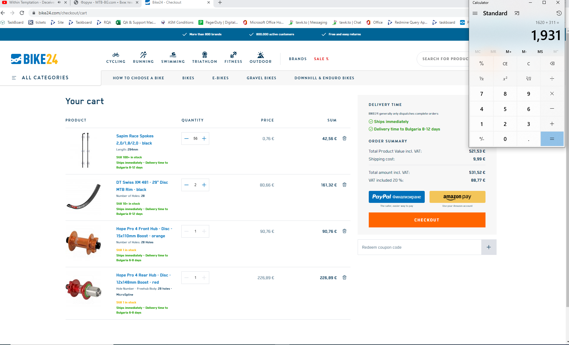 До момента всичко ми струва 1380лв със доставките, и сета ще тежи 1788 грама, според всичко претеглено на моята везна. Без лентата е това, на 10 метрова ролка ми е, не мога да дам точно тегло. И не съм сложил шайбите на везната, но тях отделно ги теглих - 14 грама са всички, значи да дойде 1820 грама общо. Даже не трябва да го смятам с вентилите, тъй като навсякъде теглото го пишат без тях.