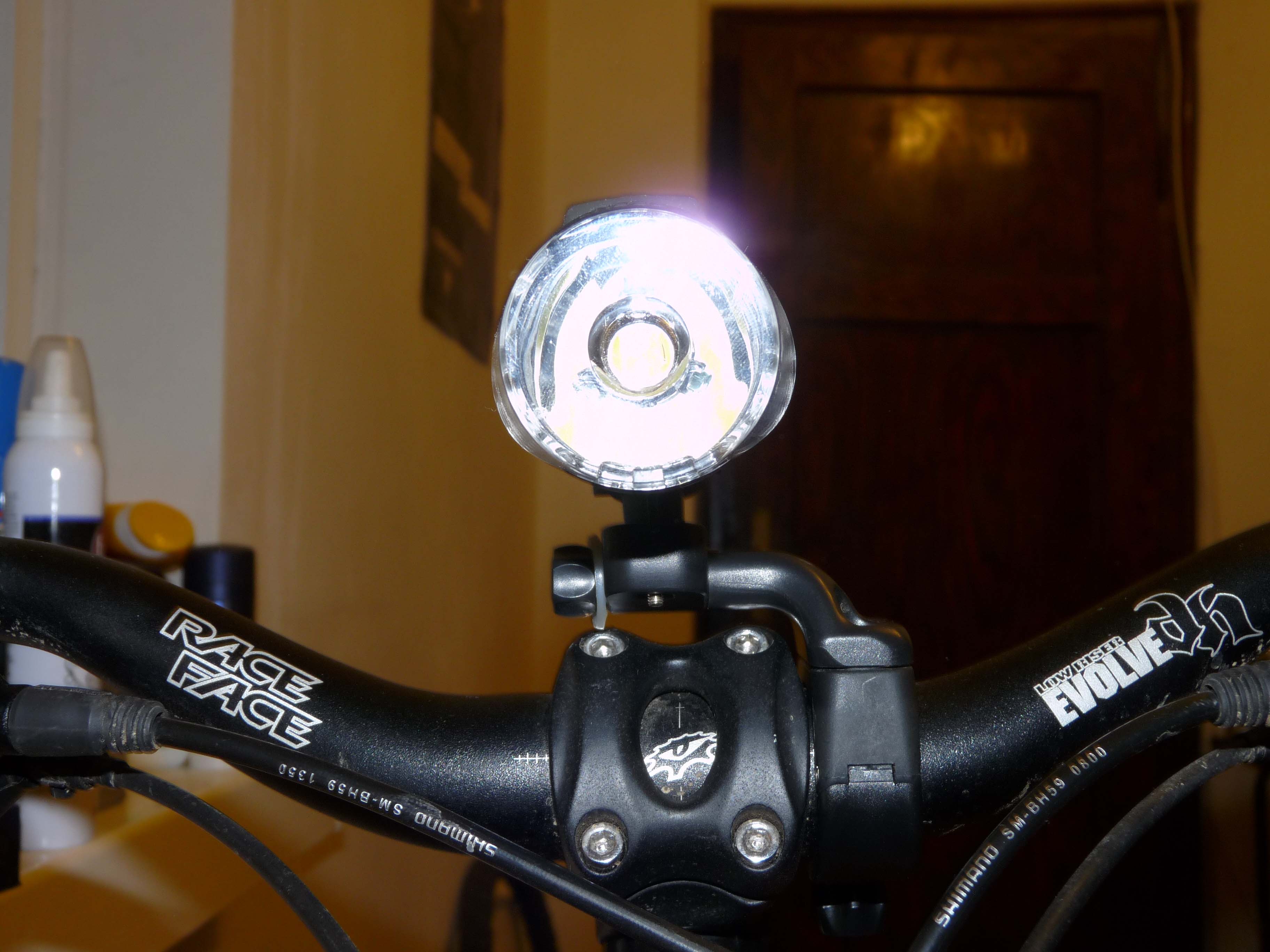След като го заредих и включих, светлината която излъчваше ме удиви. Фара няма рефлектор. Прозрачната пластмаса пред диодът всъщност е лупа която разпръсква светлината по много добър начин на 180 градуса. Фокусираната светлина е във формата на правоъгълник и осветява равномерно пътя. Всичко беше супер, само че скобата въобще не стана на 31.8mm ми raceface. В магазина ми казаха, че скобата е универсална и тн. да ама не. Трябва да се има предвид, че HL 2000 не е мислен за планинско колоездене. Купих си стойка BR28