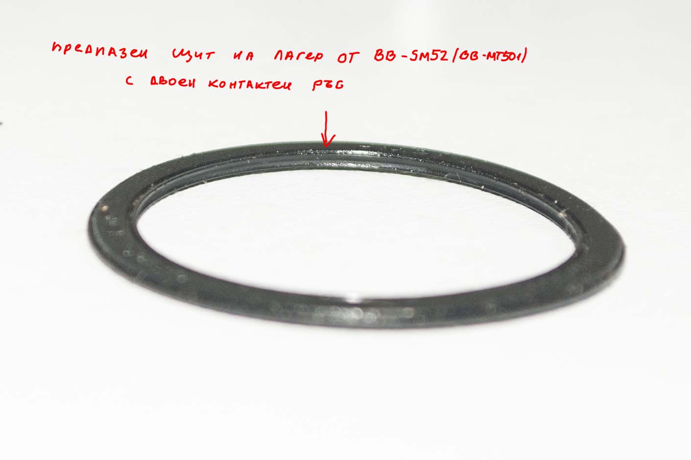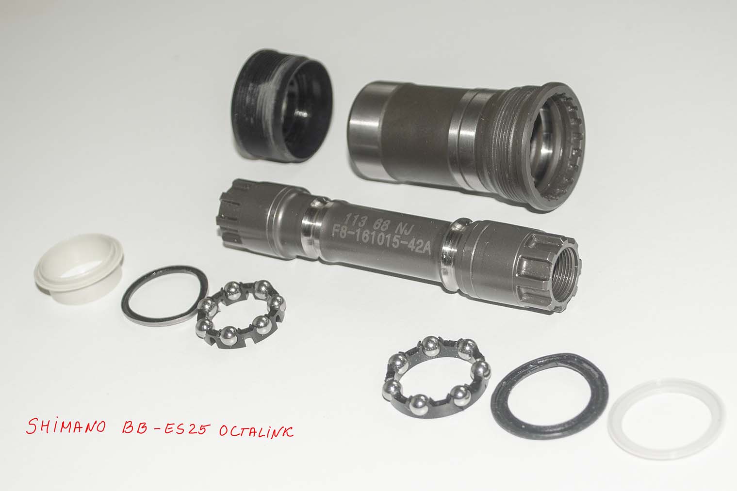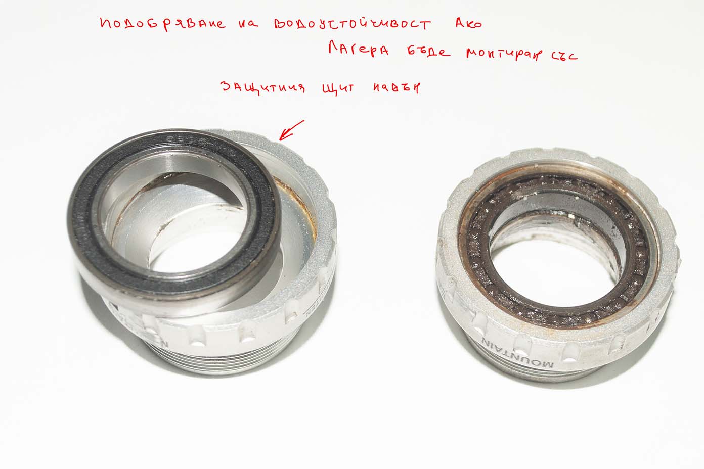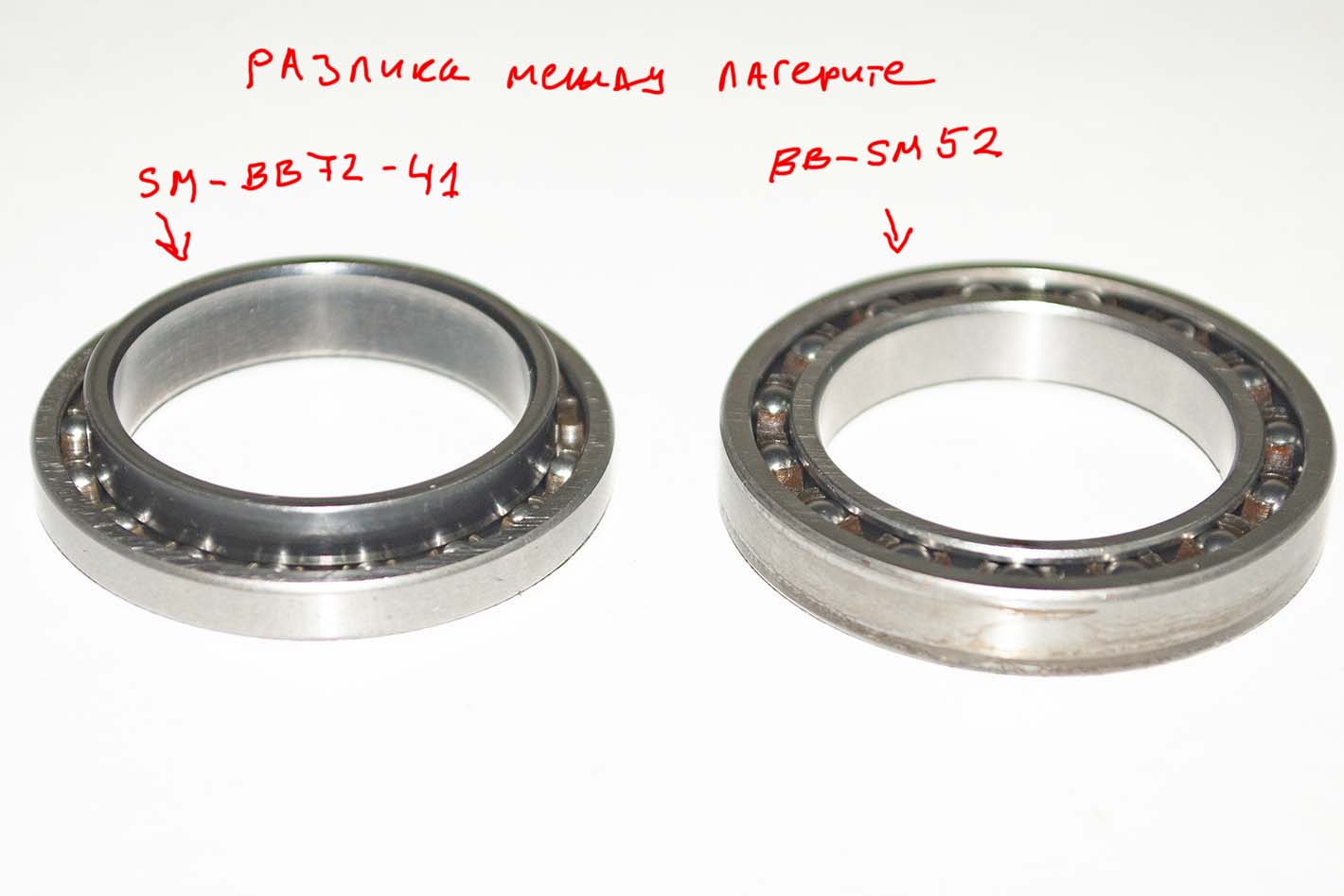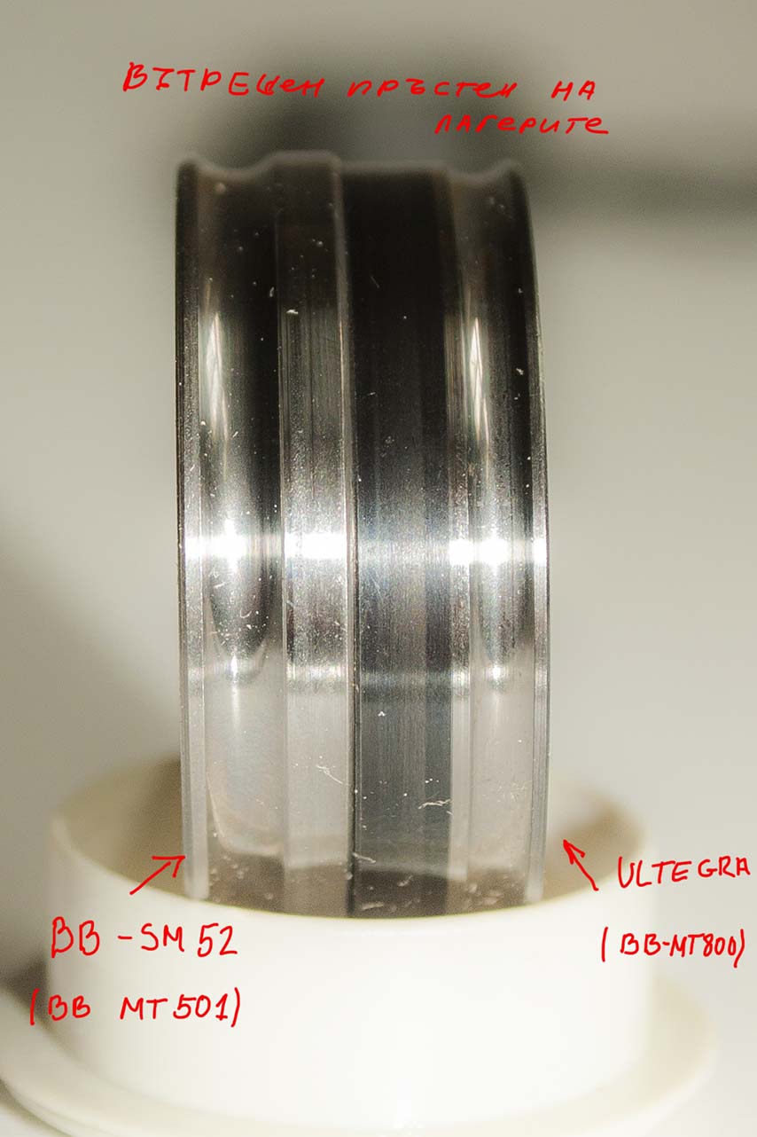 Днес разглобих няколко средни (BB-SM52,BB-ES25, SM-BB72-41) за сравнение! BB-SM52 (BB-MT501) е с (полу)стандартен лагер 25х37х6 с предпазен щит от едната (вътрешна!!!) страна. При SM-BB72-41 ( както и при BB-MT800) лагера е по-малък , без защитни щитове на самия лагер, с вътрешна гривна по-широка от външната. Материала на лагерите (от мек към твърд) - BB-MT501->BB-MT800 ->BB-ES25 . Най-добра защита от влага има SM-BB72-41(BB-MT800), следван от окталинка (BB-ES25) и BB-SM52 накрая. Тук мога да отбележа че ако лагера на последния се завърти с предпазния щит навън, влагозащитата му ще се подобри многократно! Безпорен фаворит при недобро съосие, както и по твърдост (живот) е BB-ES25, стига да не се допуска попадане на вода (миене с водоструйка и обезмаслители)! BB-SM52 е с по-фалшив (мек) лагер, но се вижда по-малко износване( изключвам че в единия е влизала вода!!!) от лагерите на SM-BB72-41, които са на около 4000-5000 км. Трудно е да се каже кой от двата би издържал повече защото много зависи от конкретната рамка на която са поставени. Показал съм как можеш да провериш горе-долу как седят нещата със съосието на резбите.Трябва да развиеш само лявата пластмасовата гайка на сегашното средно предварително и с тънки свредла (или нещо подобно в диапазон 1.3-1.8 мм) да провериш хлабината между външното тяло на окталинка и резбата от ляво!