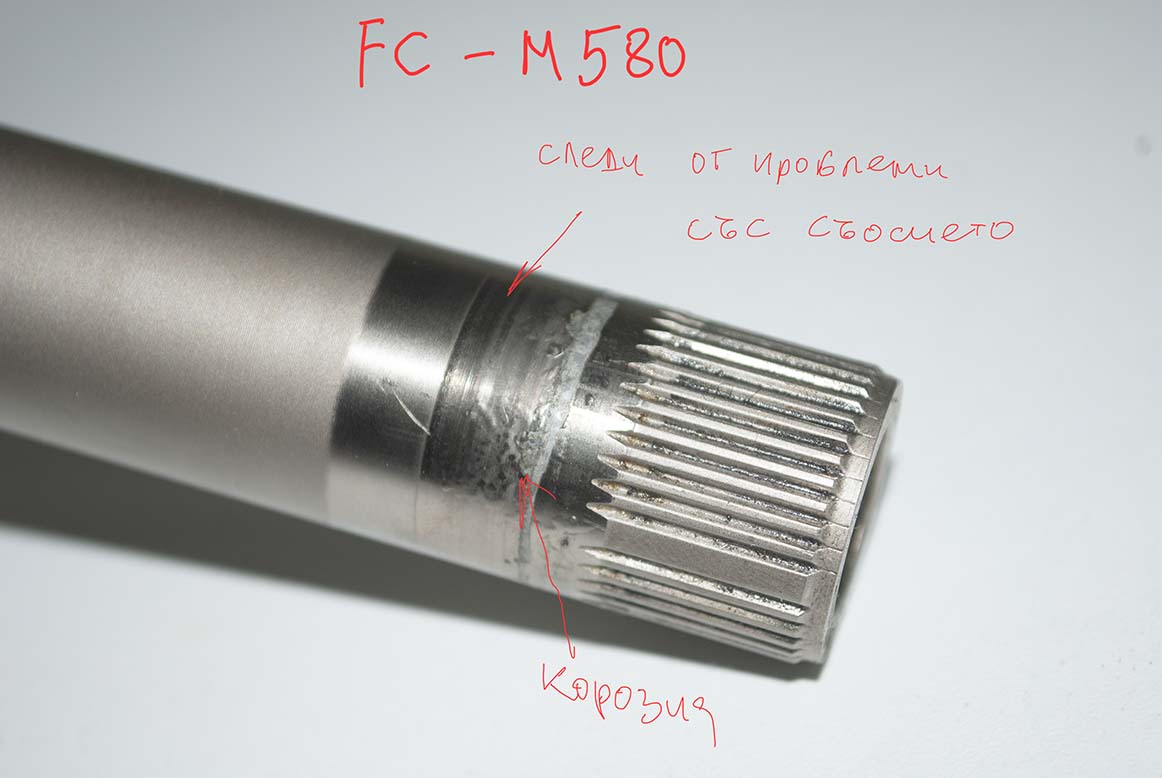 И за да не съм вън от темата, прилагам снимка на алуминиев Шимански шпиндел, с характерното за неточност излъскване в зоната на контакт с пластмасовата втулка, както и отлюспване на покритието в резултат на корозия.