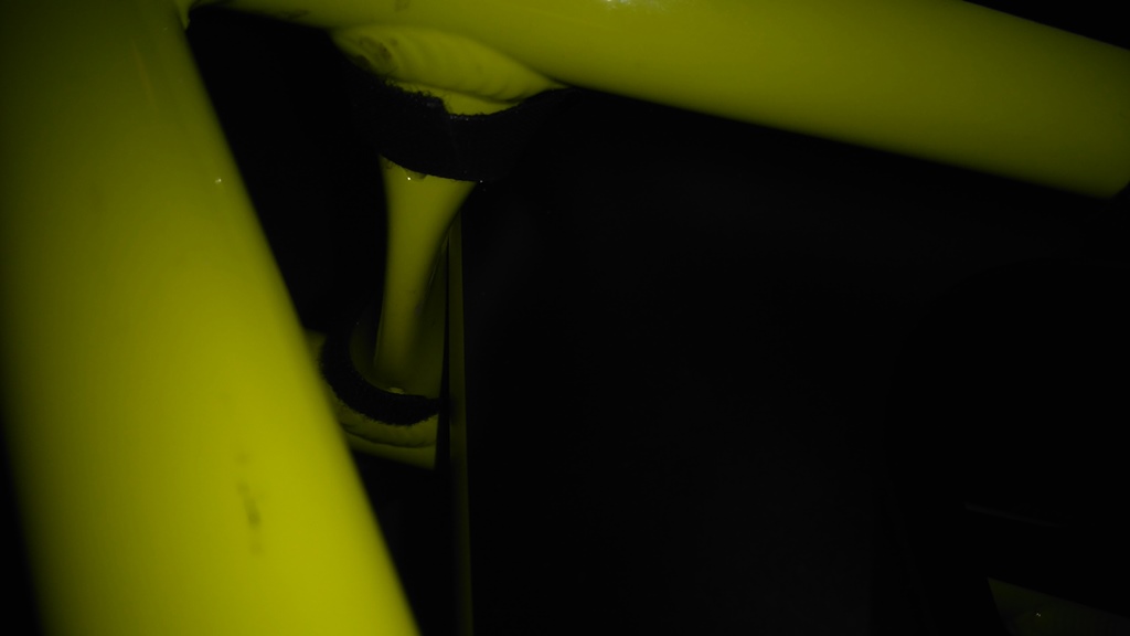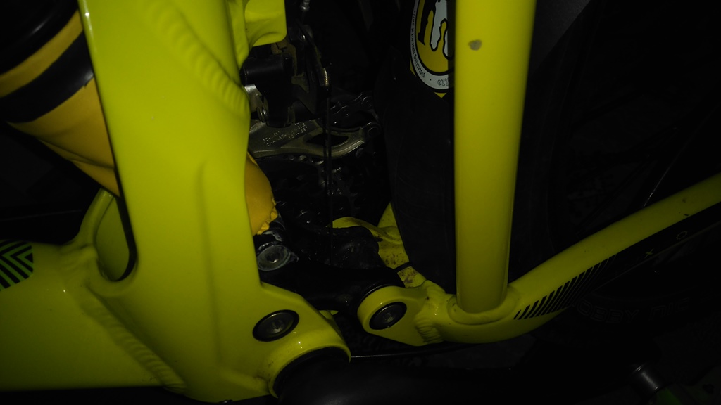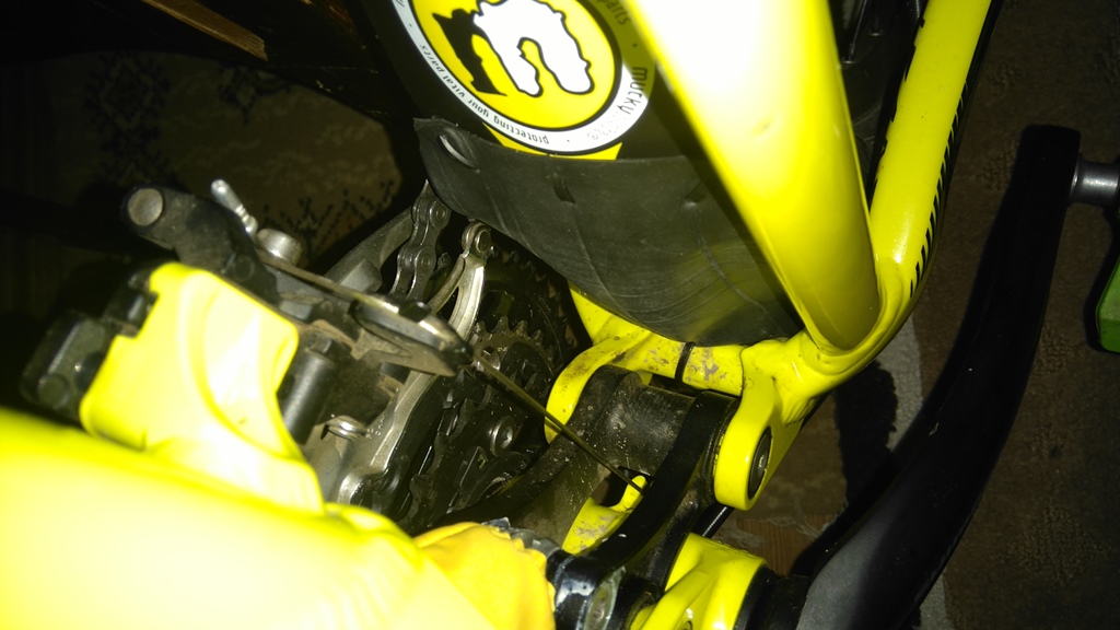 Боцкане ще има утре, че днес не остана време. Ще пусна парче гума между калника и долната част на триъгълника, дето е долната кобилица. Ще направя отвори в края на калника и с опашки ще хвана гумата там. Ще оформя с ножицата и ще хвана долу пак с опашки на две места. Дерайльорът, жилото, кобилицата и шокът ще останат изолирани от задната гума. Дори Горната кобилица ще бъде добре защитена. Утре ще покажа какво се е случило.