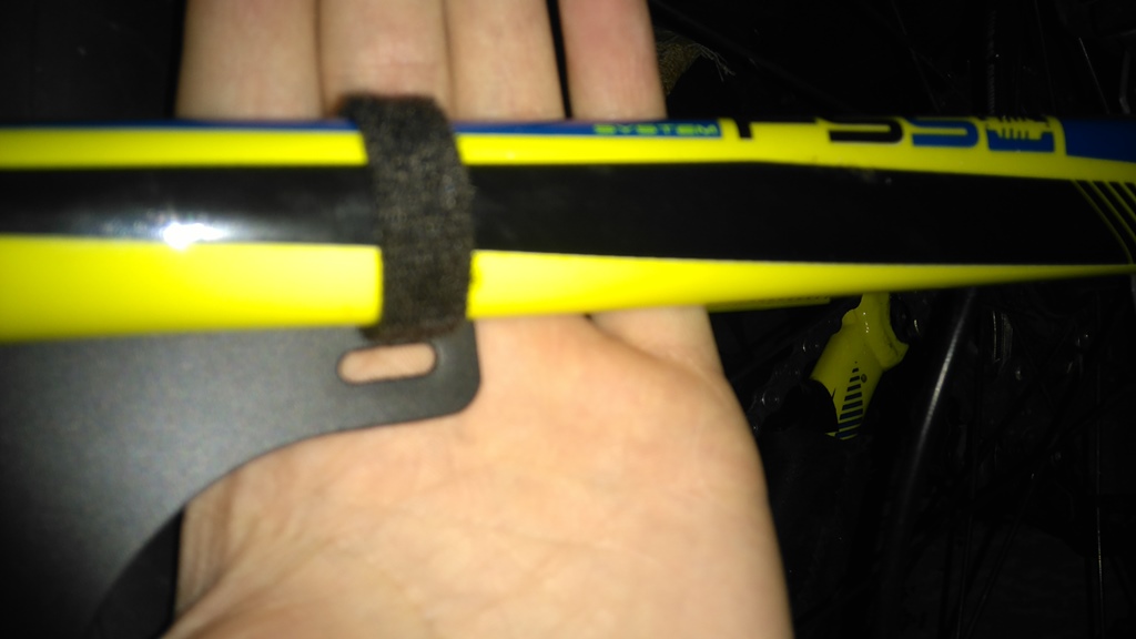 Преди малко се хванах и набързо направих ето това. Но има един малък проблем - страничните отвори на калника (където се хваща за триъгълника) не му позволяват да легне хубаво на арката. Отворите са замислени за захващане на вилка - не са в една линия страничните и централните. Задната част на калника е вирната нагоре, съответно долната част, където е хваната гумата, е близо до външната гума - има-няма 1-1,5 см. Вероятно ще се наложи да правя нови отвори горе, където се хваща на арката. Подозирам, че при леко натрупване на кал ще опира в калника. Парчето гума съм го пуснал по-дълго и е подвито, има възможност за корекция. Ще покарам и ще видя какво ще се случи, когато намеря време.