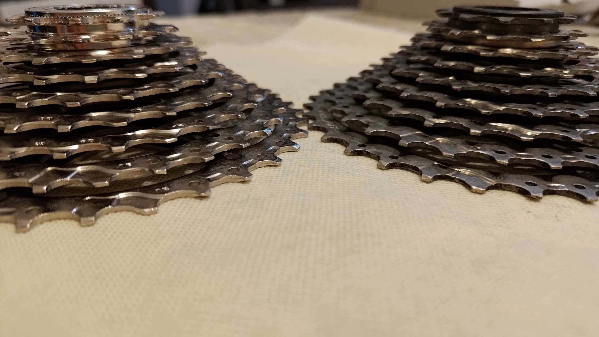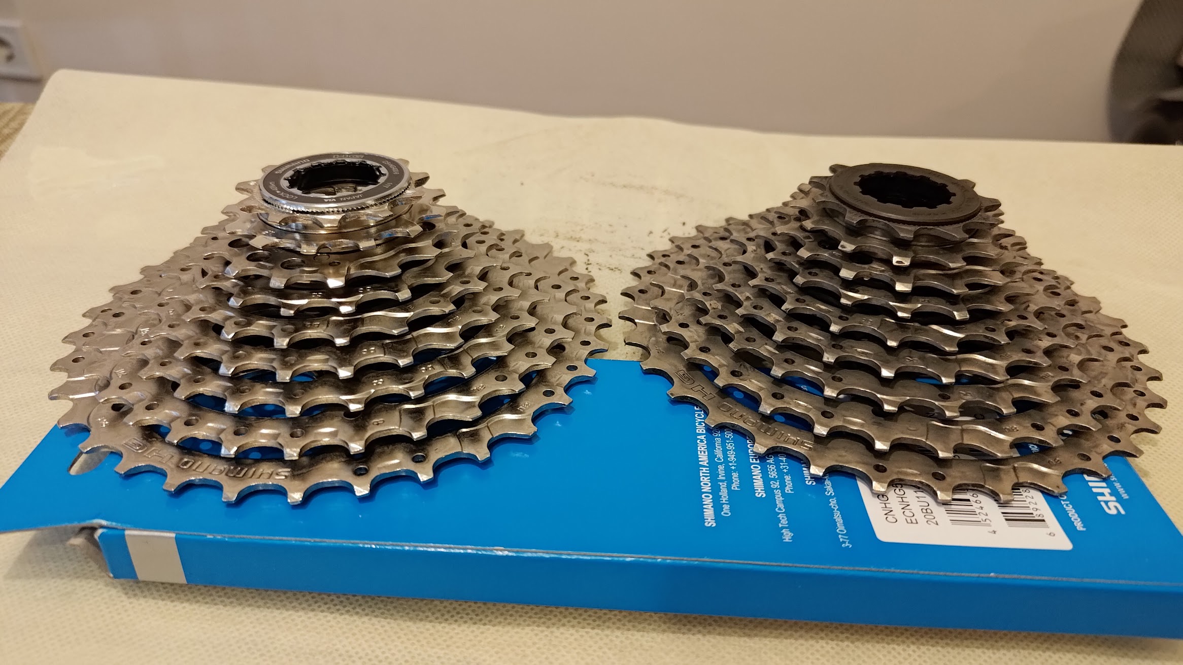 На снимките отляво е новата касета, отдясно е старата на 8 години и поне 10 000км, като смазка само е добавяна. Никога не е чистена веригата и касетата до основата, освен сега когато я свалих за смяна. Не съм я замервал с шублер, просто визуално може да се сравни. Не съм забелязал да имам някакви големи проблеми при превключването на скоростите и можеше да си карам още със старите компоненти.