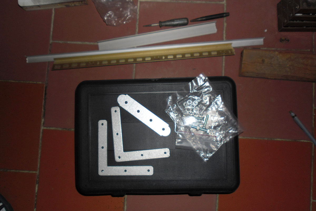 Ето с какво започнах - планки (дърводелски) от поцинкована ламарина 2,5мм Г-образните са 10х10см, а правото парче е почти 12см. и скрепителни елементи. Оказа се, че болтове М5трудно се намират по кварталните железарии.