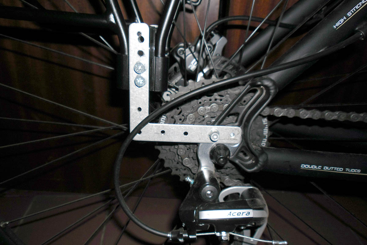 С Г-образните планки изнесох багажника с около 7см назад така не опира в спирачния апарат и слиза по-ниско. Просто ги захванах ги външно спрямо оригиналните скоби и всичко си дойде по местата. За мое голямо учудване всичко се намести и си застана право (мислех, че седи поне малко усукано) без да се налага допълнителна корекция.