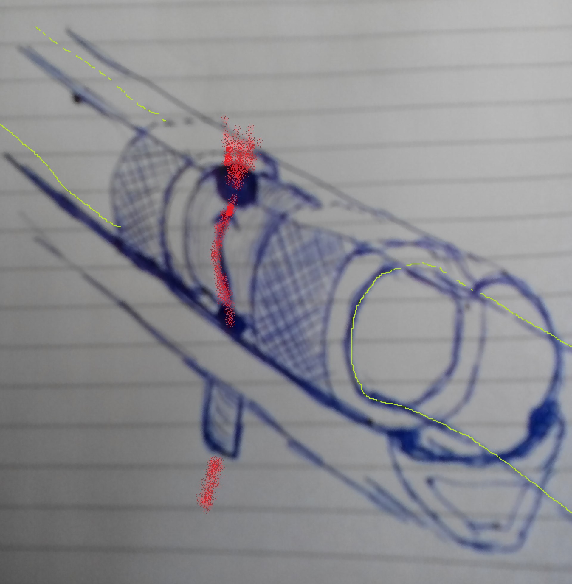 Със зелено са очертанията на тънката вътрешна гума, която минава през прорязаната ръкохватка.