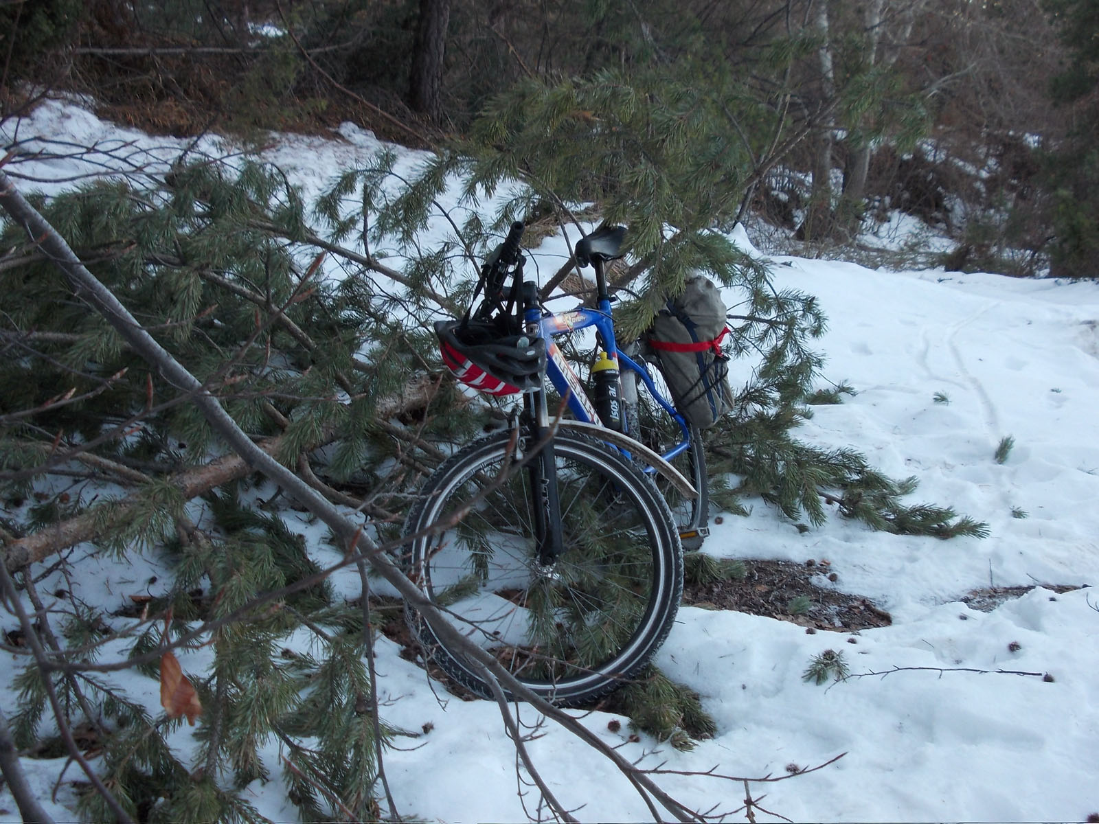 Последвалия ремонт се състоя в следното - разхлабване на спиците, използване на един стоманено-решетъчен ел. стълб, като стенд за приблизително придаване на каплата на кръгла форма. Следва натягане на спиците и центровка в полеви условия - кривината я докарах до приемлива стойност, която би позволила спиране с V спирачка. Вътрешната гума я залепих. Проблем оставаше външната гума, защото имаше цепка около 4 см и не можеше да се залепи. Тогава ми дойде на акъла да я зашия. След един предишен случай в който останах по почти по гащи, поради разкъсан панталон, вече си носех конци и игли. Та за 5 минути гумата бе зашита и аз можах да си сляза от Витоша карайки. Тая гума после изкара много време в това си състояние и накрая бе изхвърлена поради износване.