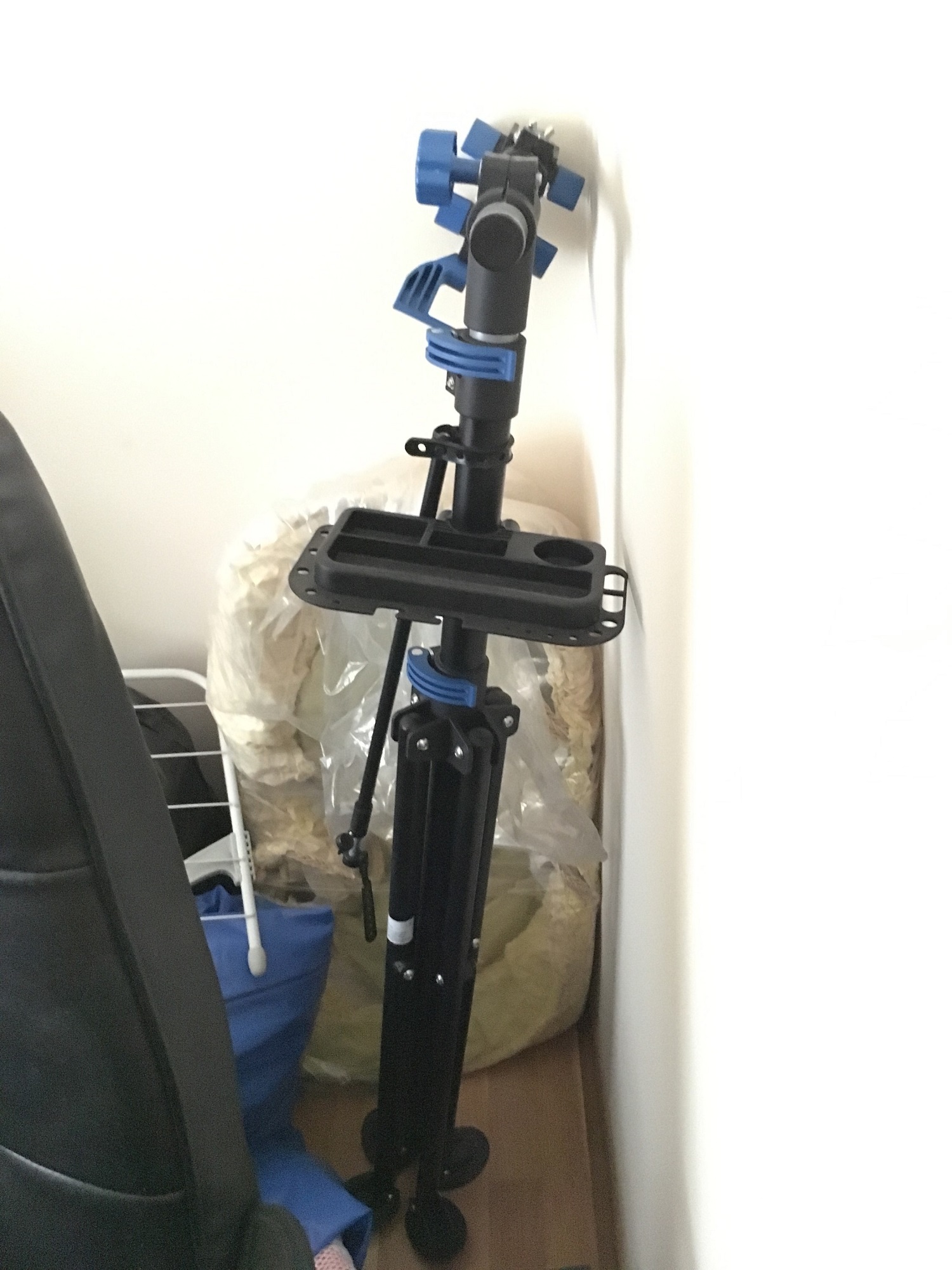 Да, може да се държи в гардероб. Тя не се разглобява и сглобява, а по-скоро се разпъва и свива. И цялата работа става доста лесно, като стягането се осъществява със скоба, подобна на тази за седалката на колело. Само разтваряш скобата и разпъваш стойката. Като разпънеш, затваряш скобата и си работиш. Снимах ти я сгъната за да придобиеш представа.