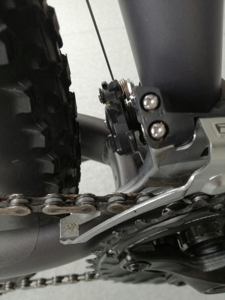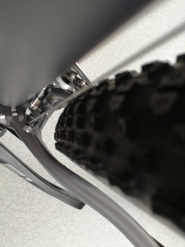 Аз не съм имал проблеми с опиране на шпайковете в задния триъгълник, карам го с класически ХС шпайкове. Според мен си има достатъчно място между гумата и чейнстея, а още по-голямо до дерайльора. Не съм го карал в супер лепкава глинеста кал, но в такава едва ли има оправия с което и да е колело. Карам го със стоковите гуми максис 2,20 и не мисля, че са нужни по-големи предвид типа колело.