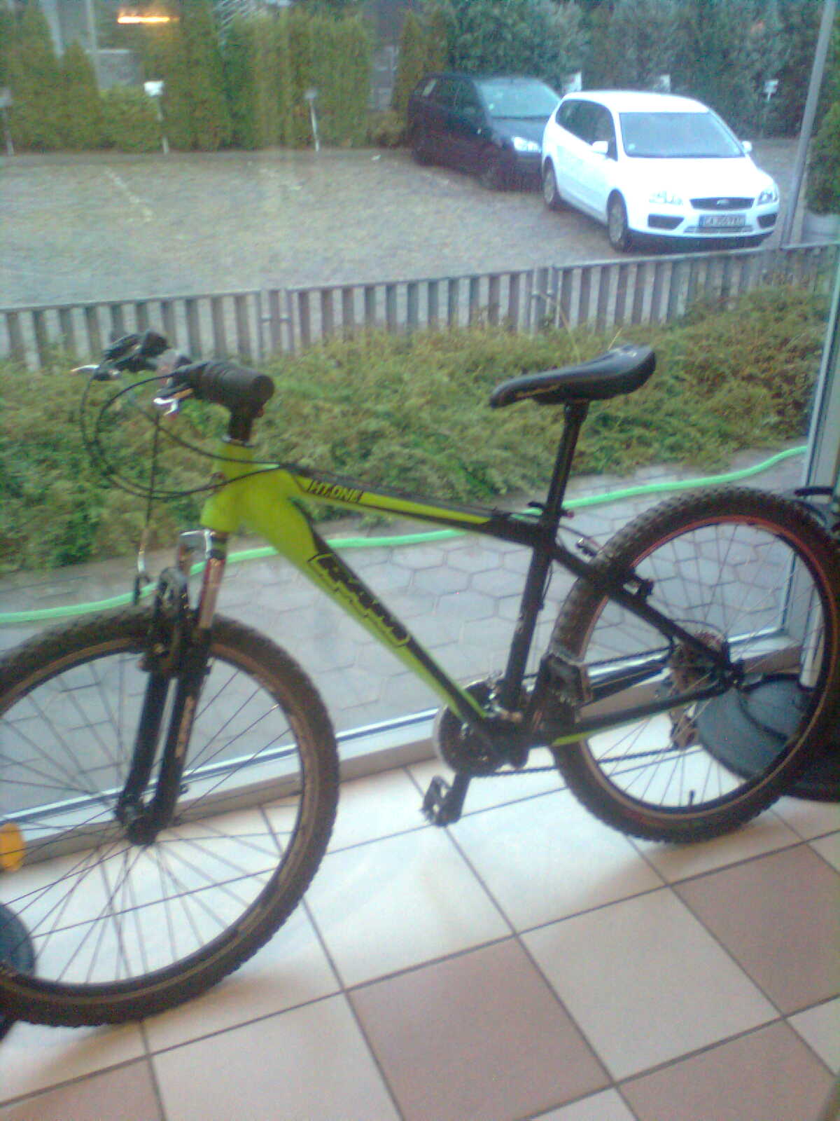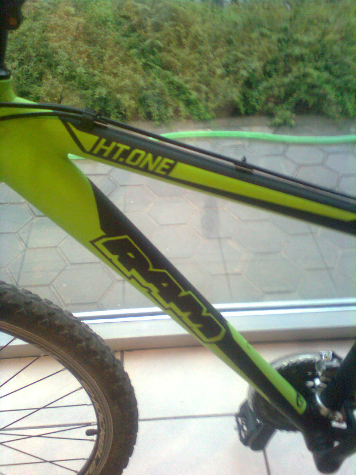 Рамка - Ram Four.x 2011 бяло зелено черно емблемата отпред е лепена повторно лепилото е жълтеникаво Отдолу при челото липсва боята и се вижда директно заварката.Драскотините са покрити с безцветен лак но под ъгъл си личи Размера на рамката е S пише го на седалковата тръба Има протектор за chainstay направен от вътрешна гума и хванат с няколко свински опашки към рамката Номерът на рамката е RAM01000073!