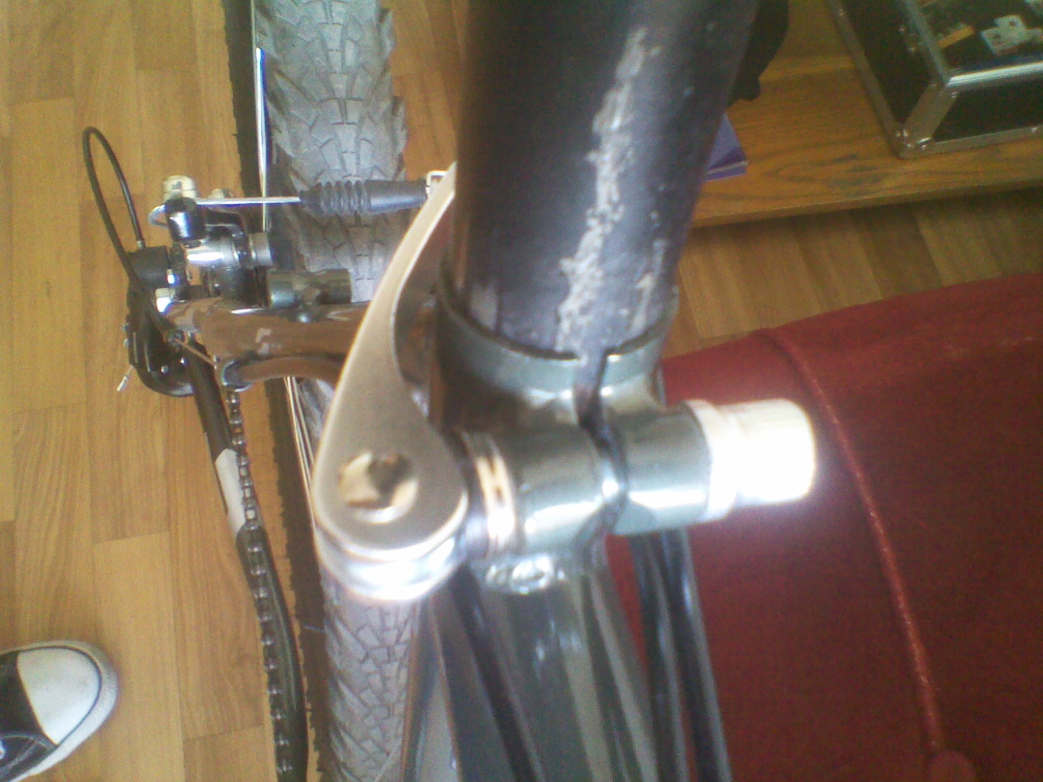 Така като го гледам как са се поогънали ушите на quick lock-а, май най-добре да ги резнеш и да сложиш скоба. Стоманата има свойството, да се разтяга на опън и обикновено това се случва с тръбата и с тези уши с времето и почва да изпуска. Но пробвай преди това да смениш гадната пластмаса с парче метал и ако не стане с него, режи! Колецът оригиналния на рамката ти ли е?
