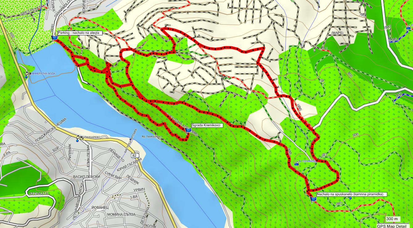 Довечера ще го погледна, може нещо да съм сгафил при обработката. По принцип аз тръгнах по пътеката по която накрая се излиза и от двата маршрута, в ляво от асфалтовият път, като си с лице към язовира. Иначе като застанеш в центъра на паркинга пак с лице към язовира, в ляво има една доста стръмна и широка алея или по скоро черен път, но въпросното нещо стига на 20м по-нагоре до една вила и свършва пред метална ограда.