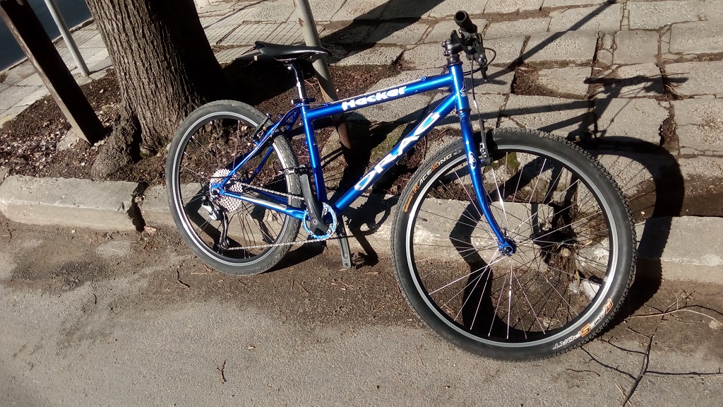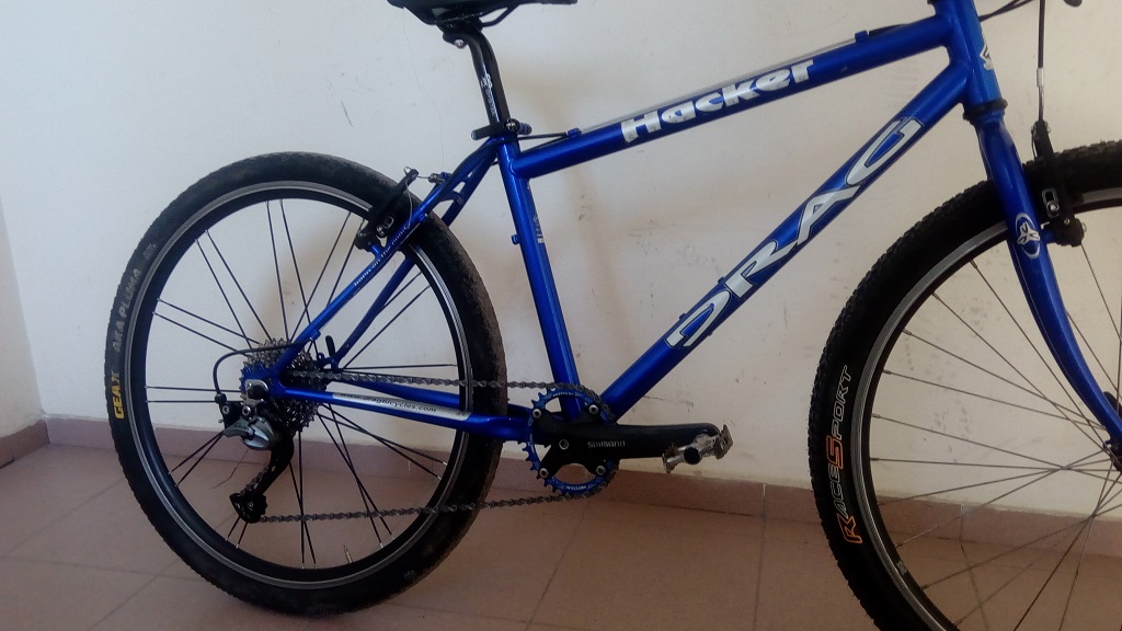 В мазето се подмяташе една стара ,но почти некарана рамка на Драг - около 15 годишна ,дропаути без възможност за стандартно ухо ,каплите бяха с касета на венец 6 скорости едностенни и много тежки .. реших да събера на щерката (12г) с нея някакво прилично велосипедче ,и се получи това :