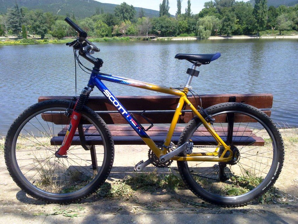 Здравейте казвам се Петър на 29г. от Стара Загота.Взех си байк SCOOT ползвано в мн. добро състояние.Изцяло алуминиева рама.Предна амортисьорна вилка ROCKSHOX .Скорости Shimano Deore XT 9. V Brake на deore които по нататък мисля да сменя с хидравлични дискове спирачки.От към първата смяна която направих е нова верига shimano и задна касета,защото бяха доста поизносени.Като цяло много добре се държи на пътя и плавно превключване на скорости.Гуми Schwalbe Smart Sam в добро състояние.Общо взето това е.Когато ми остане време ще го нащракам :)