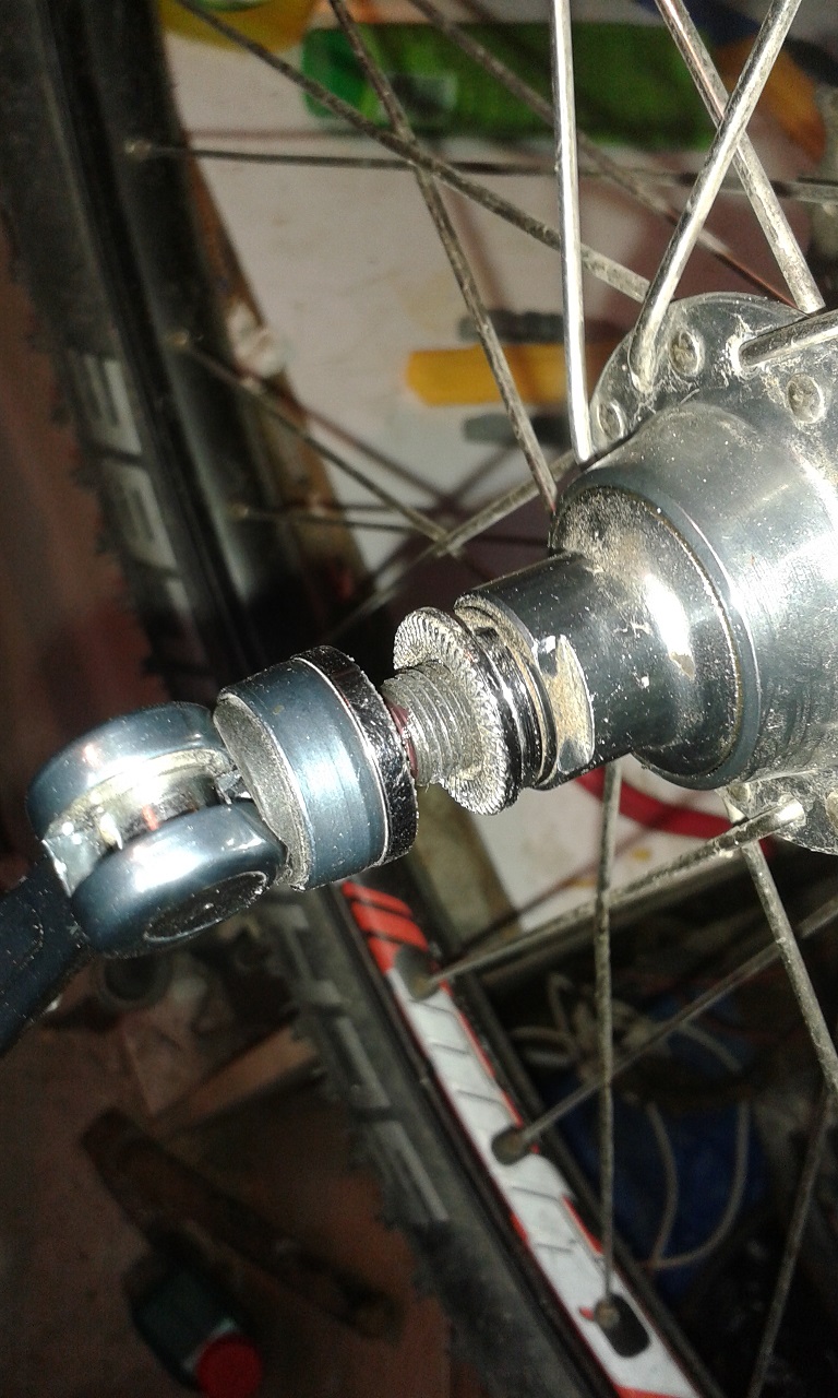 Въпросът ми е, тази гайка от страната на лостчето , там ли трябва да бъде ? На снимки в интернет, както и на старата ми главина няма такава. Проблемът е, че има лек луфт още от нова и нещо ме съмнява, че не е както трябва.