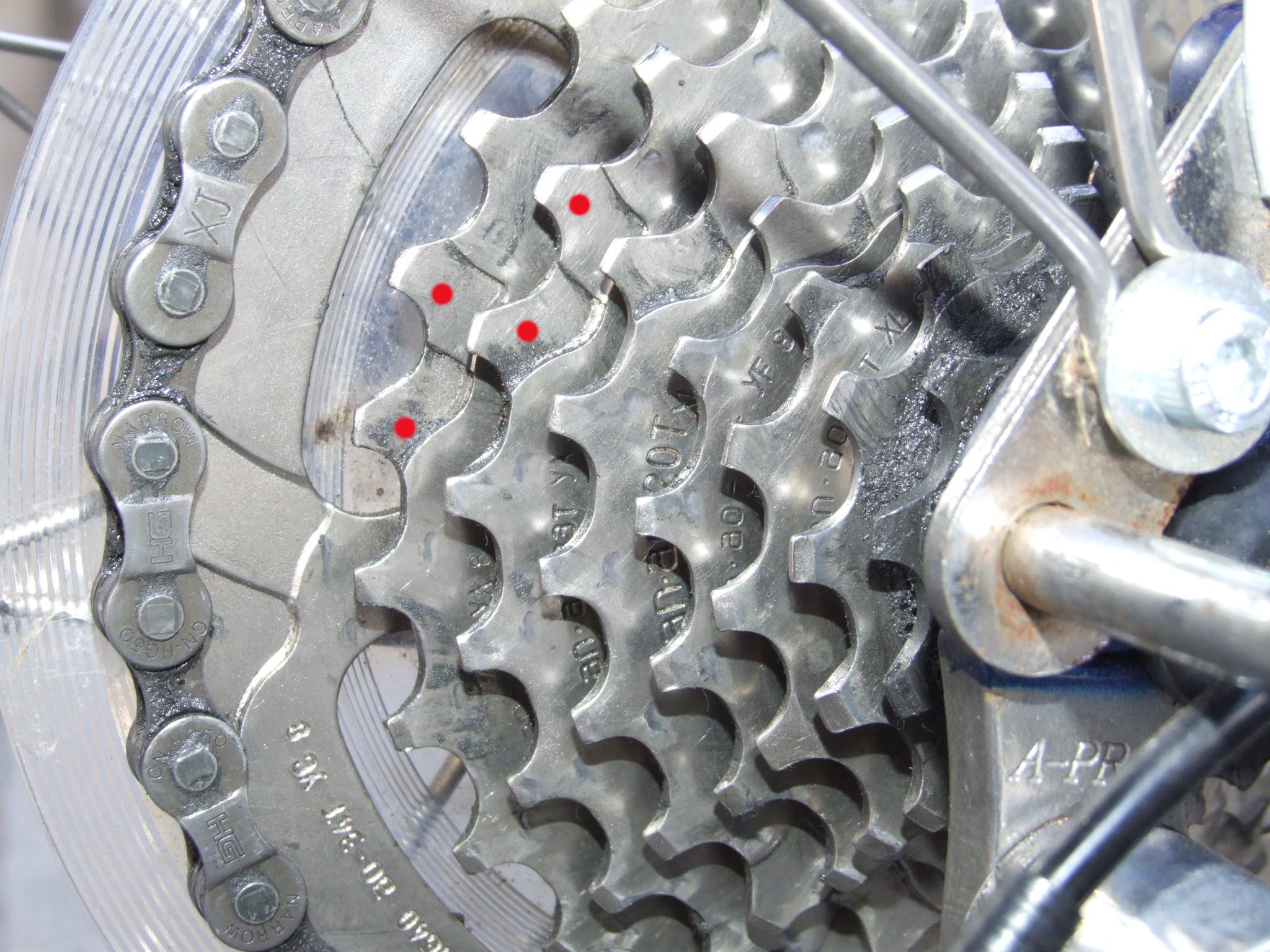 (Съмнителните зъби на 1-вата снимката съм отбелязал с червена точка, но пак казвам не разбирам може и да са си така.) Обещавам още събота да измия касетата и веригата и да смажа с подходяща смазка