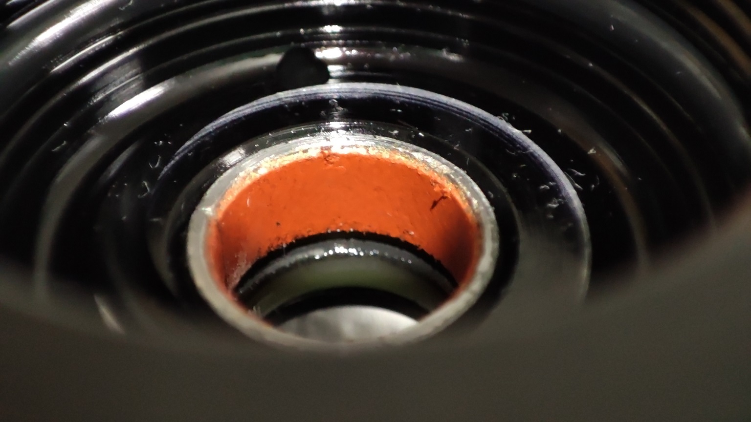 Това оранжевото ми се струва да е същия материал (нещо тефлоново, полиамидно или кой знае какво) като на втулките на вилката (които имах щастието да сменя миналата година). Ако се е оголило до алуминий, освен ново, едва ли има друг вариант.