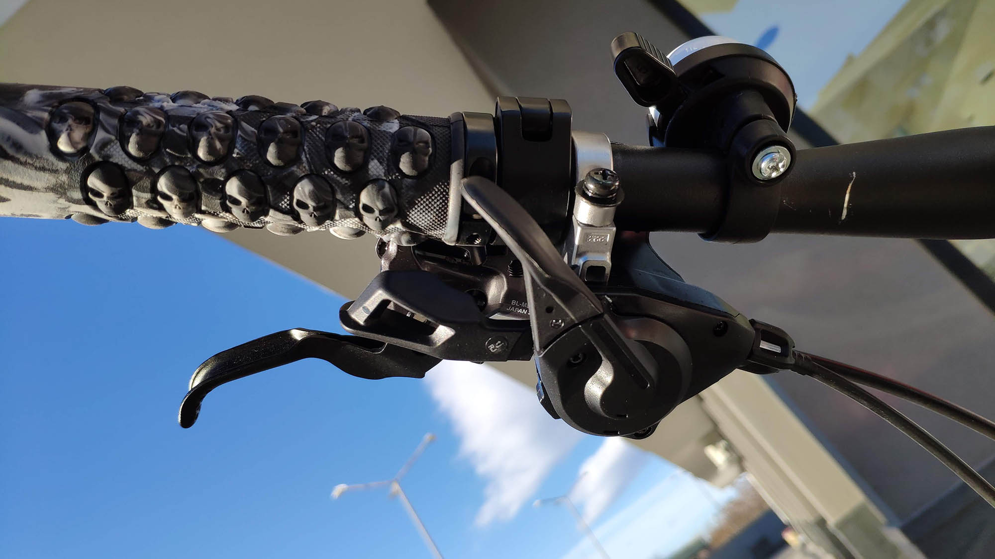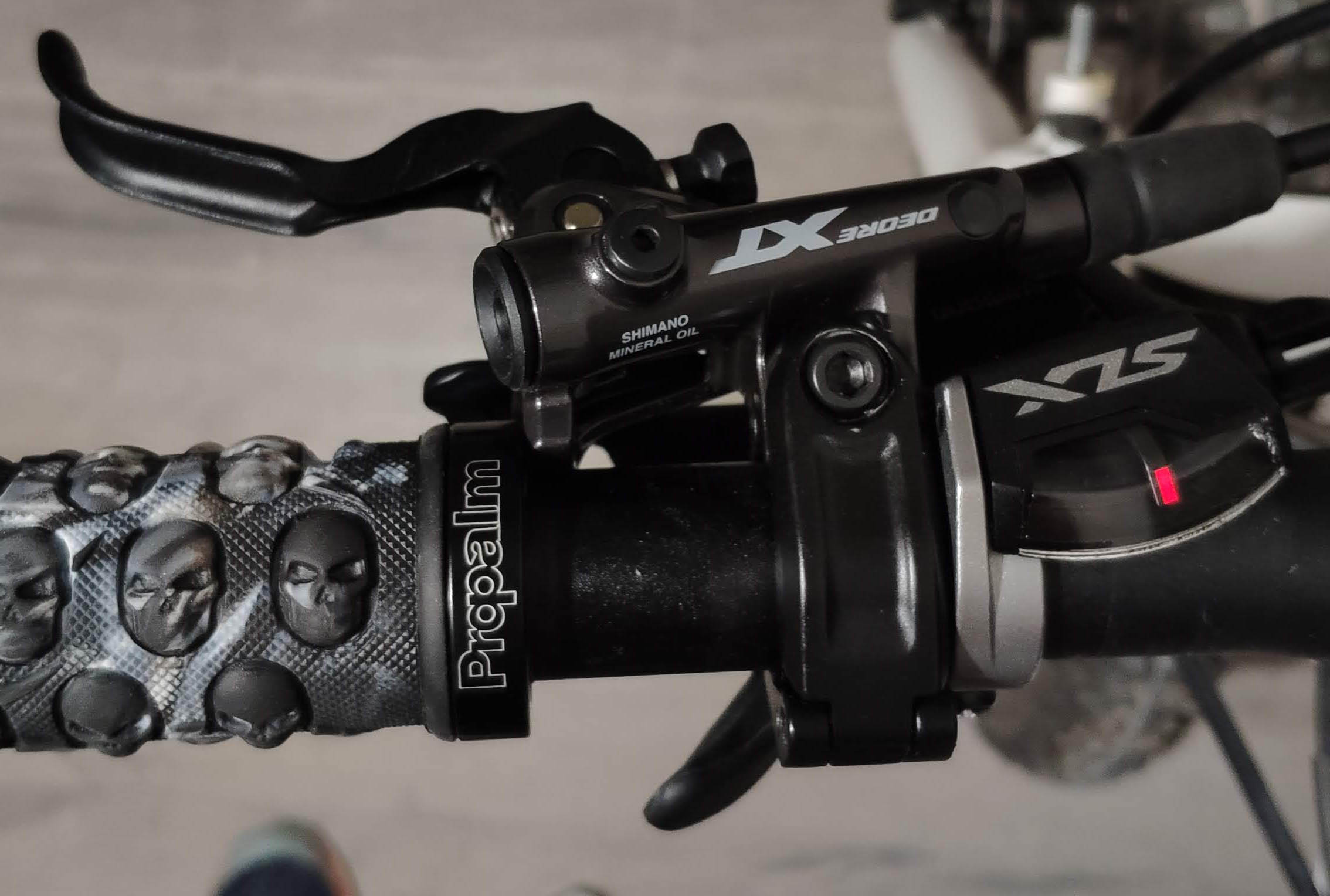 също така спирачката не се забива плътно до грипа то от там идва цялото неудобство ,премести я 2-3 см навътре заедно с командата и ще си дойдат на мястото нещата - този израстък на края на спирачката трябва да опира в кормилото ,а не в грипа ( даже в момента вероятно е накриво цялата спирачка ) :beer: