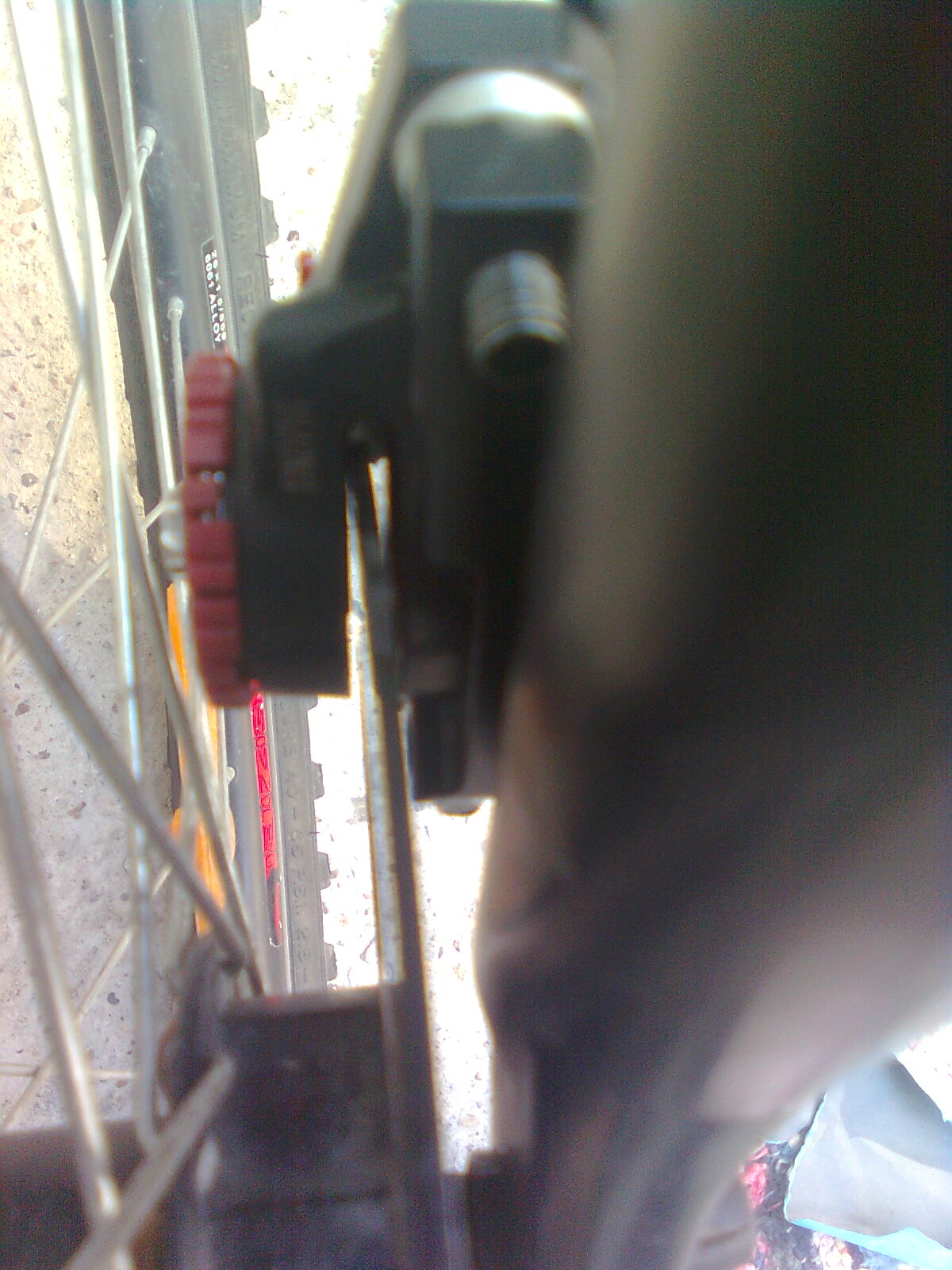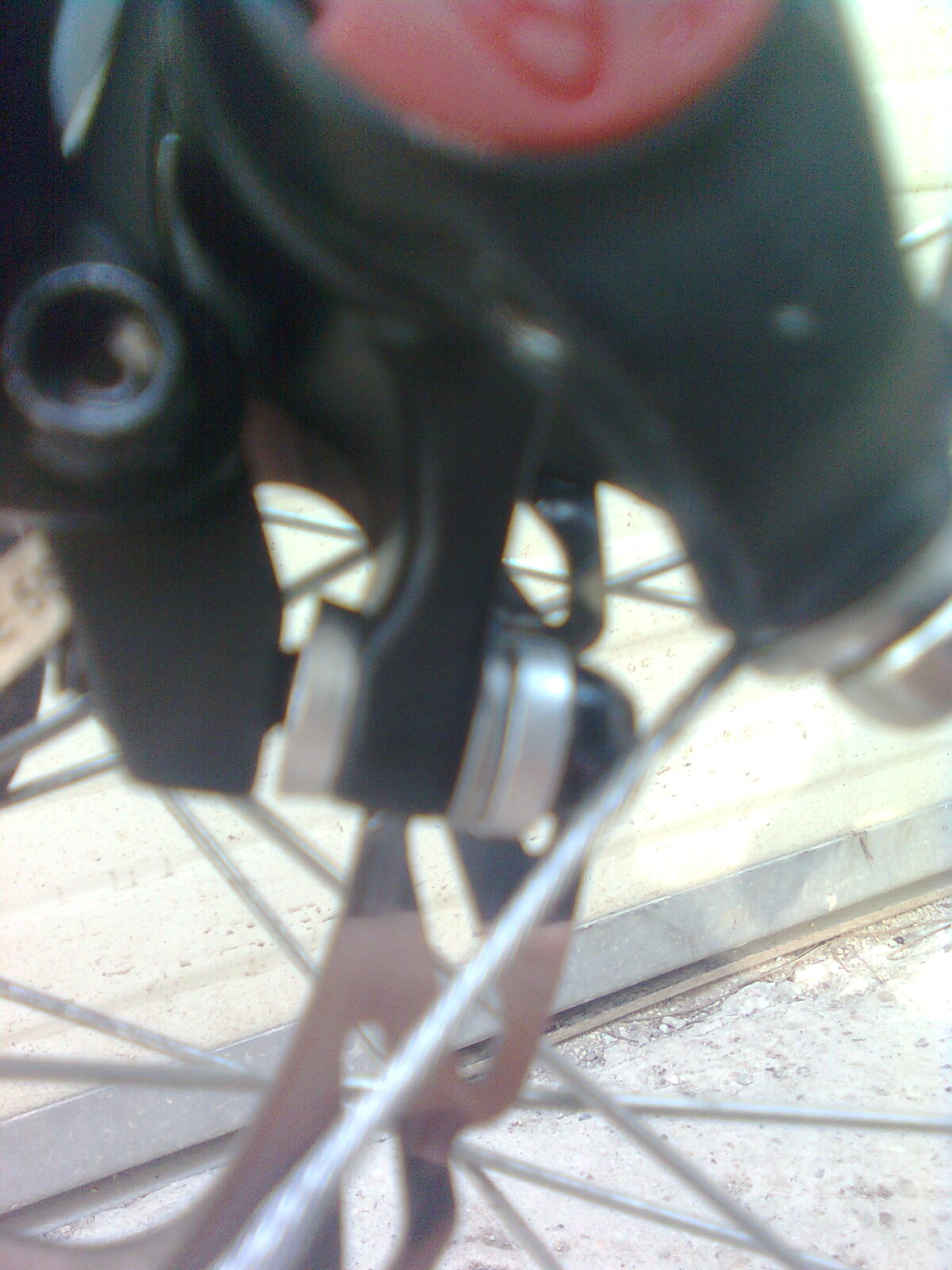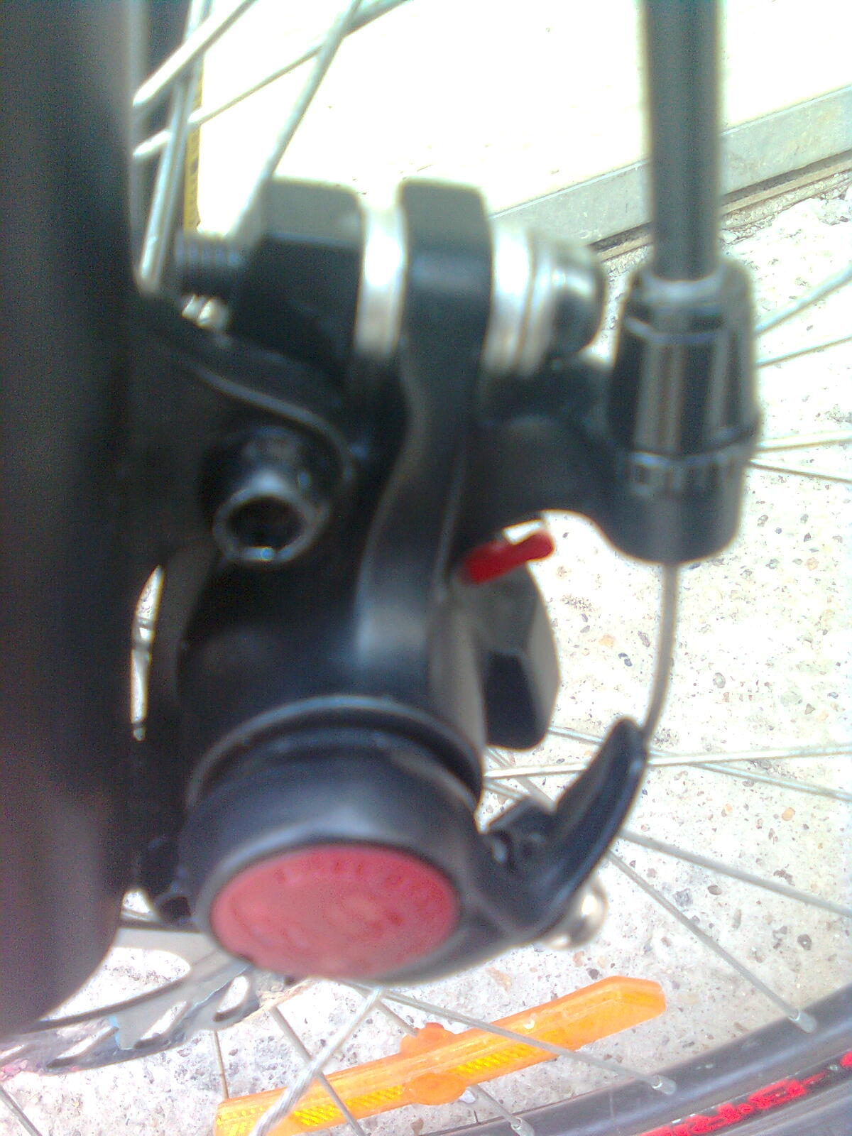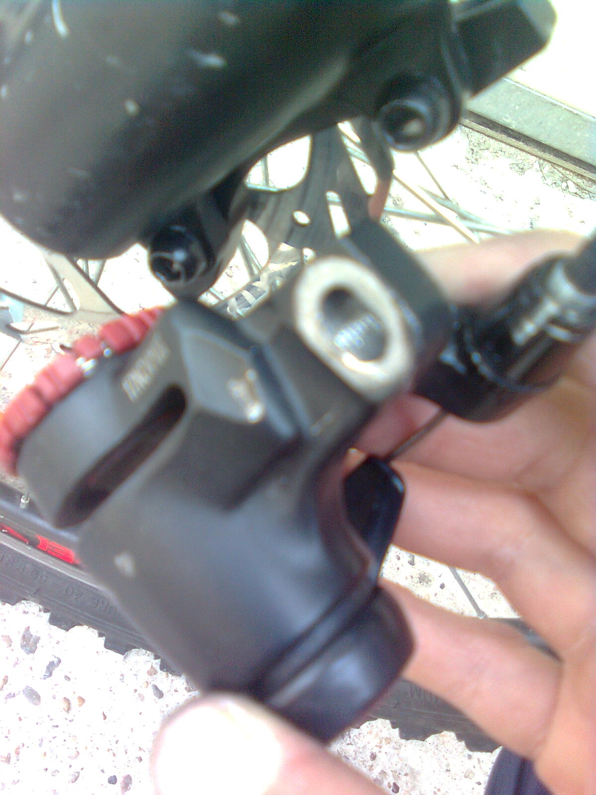 Другото, което ми идва наум е нерегулирана вътрешна накладка, заради която диска да се криви и апарата да застава накриво - регулирай я, така че да опре в диска, след което още 2-3 позиции, центрирай с лоста и затегни, след което я върни 3-4 позиции с врътката.