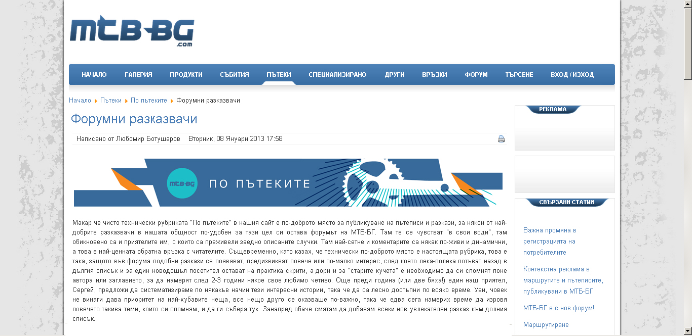 Иначе благодаря и на двама ви за предложението да помагате - при първа възможност ще се възползвам и в други насоки. Казвам ви още нещо, от което МТБ-БГ има нужда - няколко банера за авто-реклама, т.е. за някои статии или рубрики, които е хубаво да се четат и преглеждат от хората - Маршрути, GPS следи, Календара със събития, рубрики като "Съвети" и "Сервизиране", статии като Устройство на планинския велосипед и Геометрия на планинския велосипед. Банерите трябва да са с размер 728х90 или 160х600 пиксела.