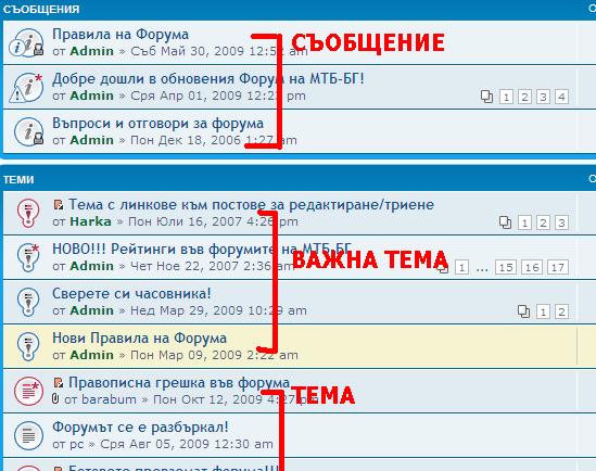 Освен това всяка тема може да има статус "съобщение", "важна тема" или само "тема", като всяко от предходните се подрежда над останалите, несависимо от датата на последен пост.