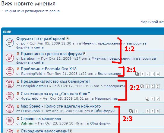 рс написа:Когато искам да видя новите мнения или собствените си мнения, и съм настроил да подредбата да е по време, не е ли нормално да се подредят по времето на последното мнение (или избрания критерий)? Разбира се, ако има няколко закачени теми в началото, те са си там винаги - не говорим за тях.