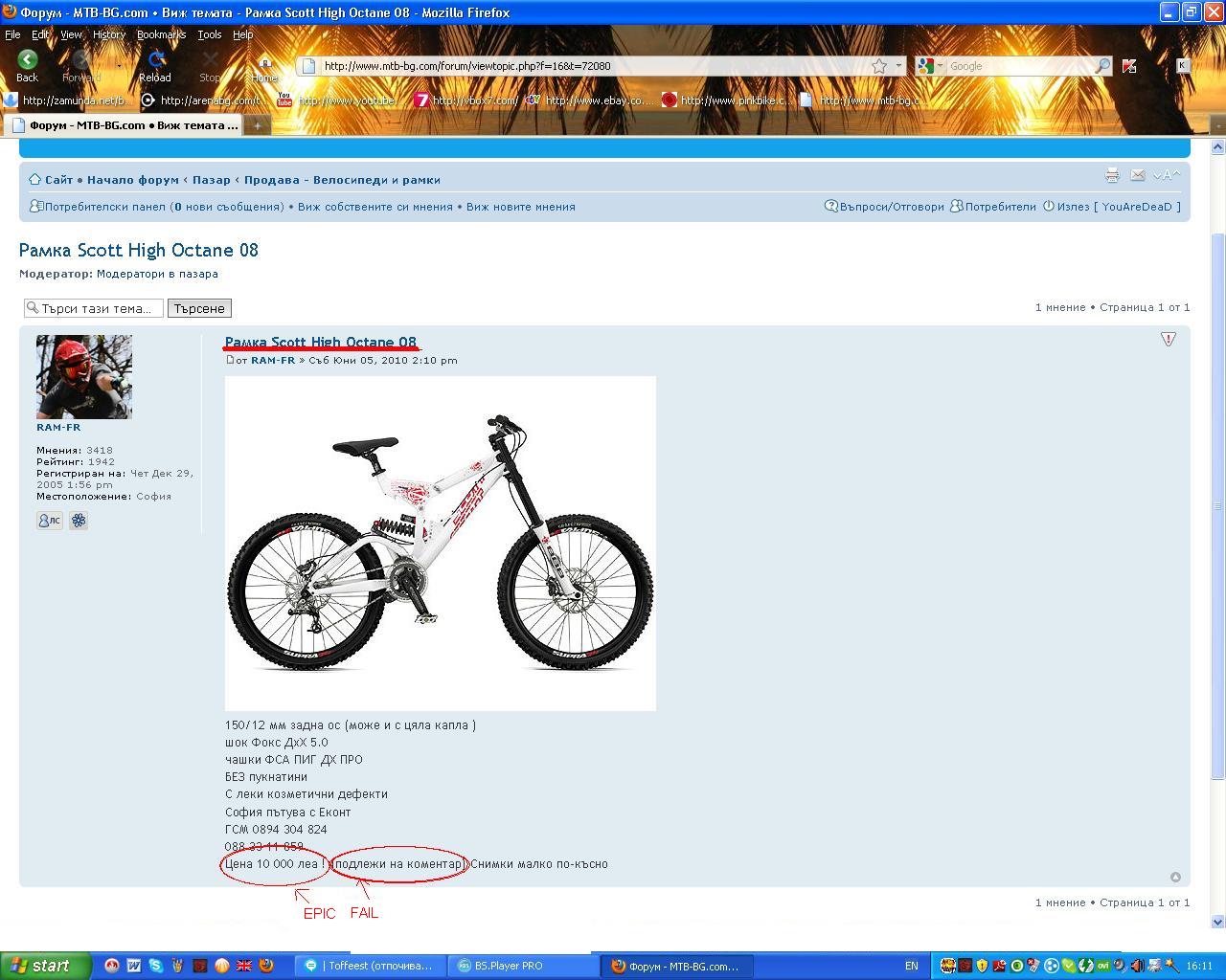А когато го попитах на ЛС дали не е станала грешка с цената,защото бях заинтересуван от тази рамка,получих отговор "Аз мога си я продавам за колкото искам "