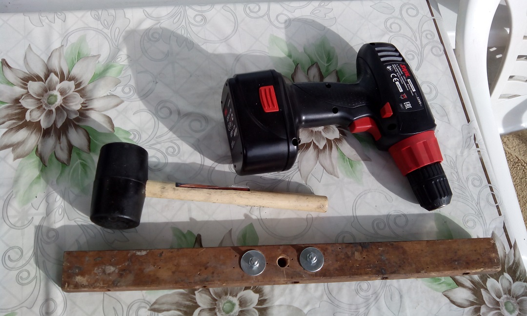 До тук добре, но после тръгнах в грешната посока, започнах с едни сложни инструменти , които няма да показвам, после направих този дървения който се вижда на снимката, пробих две дупки в капачката и успях с мъки да я завъртя на 1/2 оборот, от което поне разбрах че не е на резба като другите подобни главини, а на конусна пресова сглобка, при това с лепило