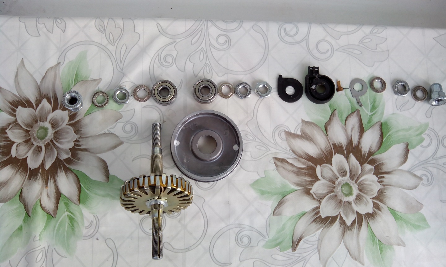 А сега за разглобяването на главината, ако нямаш схема или понятие от устройството - трудна работа. Изгледах доста клипчета в интернет, но тук излезе съвсем друго. Първо се развиват всякакви гайки , контрагайки и шайби за да се стигне до клемата.