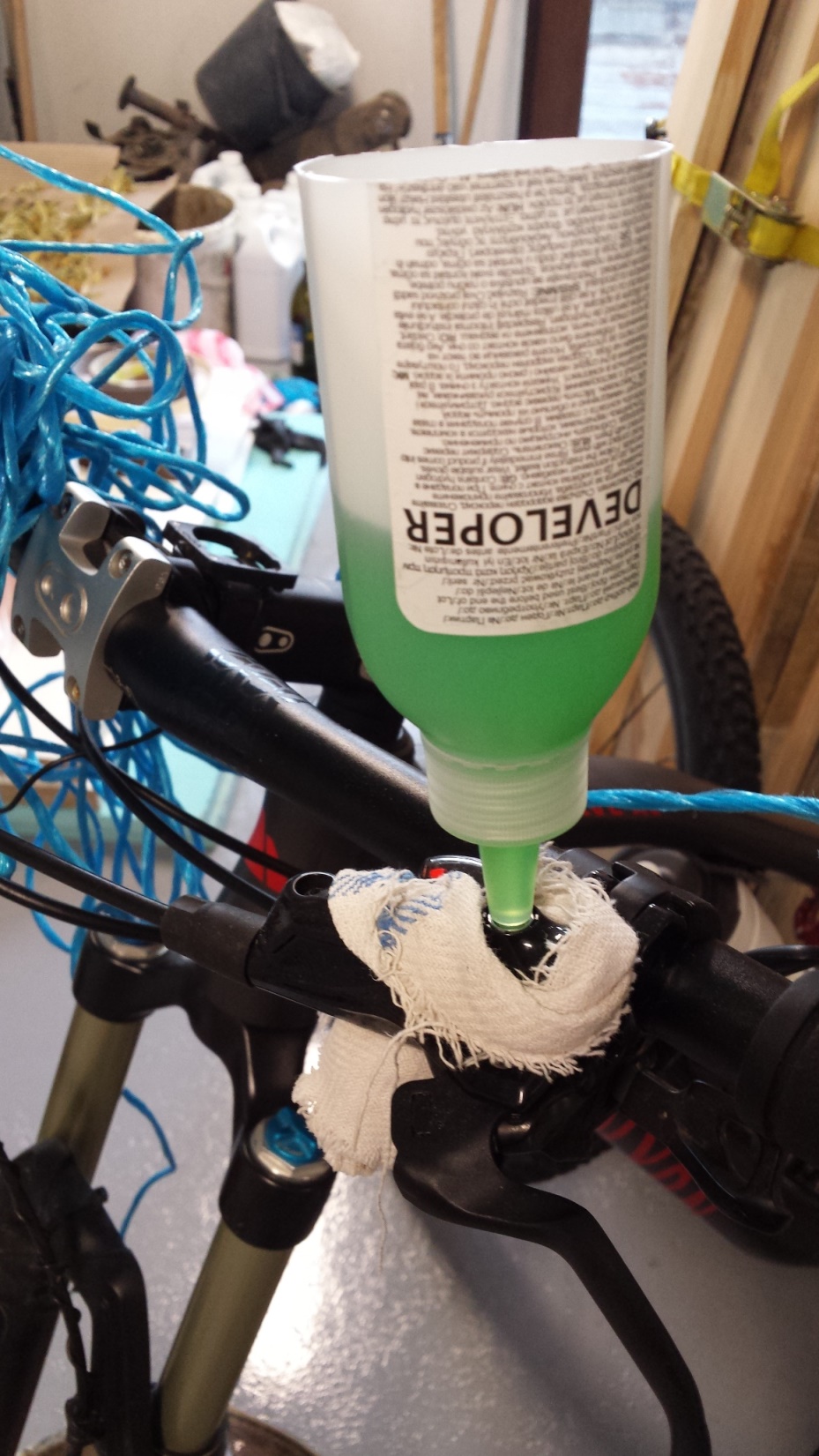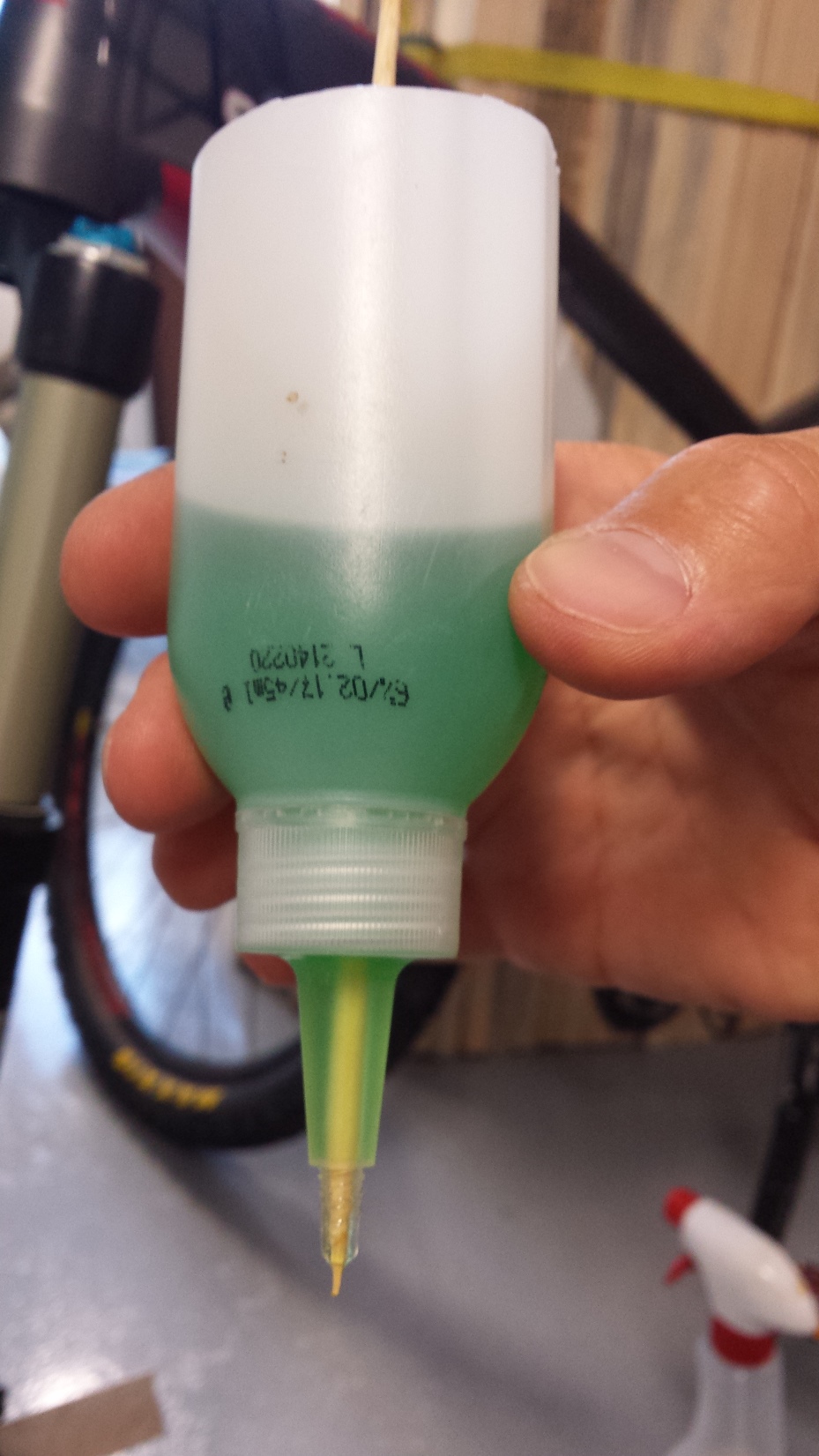То няма много за обясняване, успях да сменя течността без да капне капка или да олея нещо. Прекарах по 50-60 мл течност, още на 10мл вече беше зелено в шишето. Почуквах броните, ако има полепнали мехурчета, да не се срамуват, а да излизат нагоре. Задната спирачка я свалих, за да дойде най-ниско точката на вливане. Запушвачката от шишче работи перфектно. Само да поясня, че шишетата са с различно дебела гърловина, това което ми пасна беше малко по-дебело от останалите. Целта е да се навие в резбата на спирачката и да се държи само и да уплътнява. Шишчето се набучва в края, преди да развиете шишето.