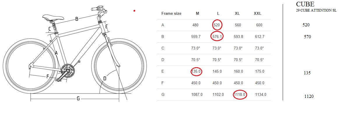 Здравейте! Нов съм във форума и искам предварително да се извиня, ако пускам темата не където трябва. Закупих си байк CUBE ATTENIOV SL 29 от интернет. Просто не издържах на офертата, а и търсех точно това.Много ме кефи колелото, но имам няколко питанки. Размера уж е L. Измерих колелото и го сравних с посочената таблица в един електронен магазин за велосипеди. Моите размери съм ги дал в дясно и съм оградил в червено горе долу къде се намират по таблицата. Според вас какъв размер е велосипеда по така измерените размери? На рамката ме шокира надписа XXL. Иначе като го прекрача и между рамката и четала ми има около два пръста разстояние. За първи път карам планински велосипед. Преди доста години имах шосеен и доста го разтривах, но от известно време бях поспрял с колоезденето. Сега реших отново да възобновя карането , и на първа среща с новото колело излязоха тези въпроси. Колелото няма да се кара много екстремно/ предимно по вело алеи и черни пътища за разходка/Висок съм 185 см. и според мен отговарям на размер L. Това XXL ме изненадва откъде идва при тези измерени размери. Благодаря предварително.