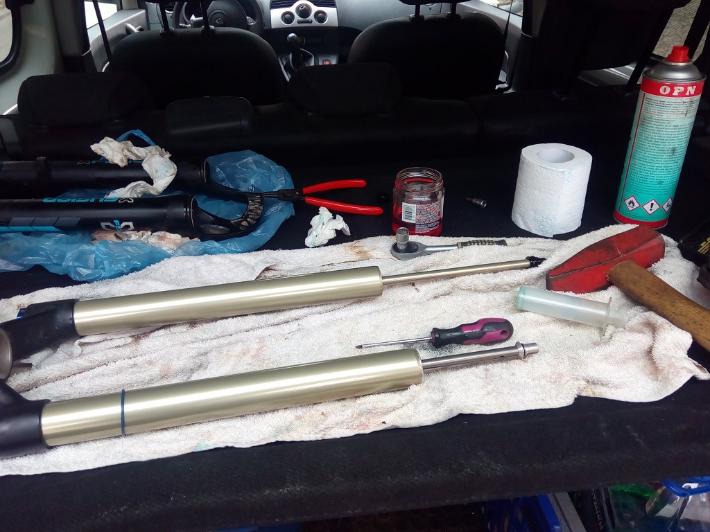 Първо сервизиране на вилката . Много е елементарно и не изисква специални инструменти ,само с врътката на ребаунда трябва да се внимава ( там по принцип дават един специален инструмент ,както и за развиване на въздушния патрон отдолу но може и без тях ) . След 1г ползване вътре беше като нова ,единствено прахоуловителите бяха поизсъхнали . Регулирането на хода е от 100 до 160мм през 10 мм със спейсъри и чоп на стержена тъй като негативната пружина е метална като на Фокс 34 до около 2016г ( според мен вилката е изкопирала доста неща от тоя модел вкл някои части са напълно еднакви ) ,и не изисква никакви специални умения инструменти и скъпи части . Използвах момента да я вдигна от 130 на 140 мм ( рамката ми съществува и с 2та размера вилки фабрично та прецених ,че не се променя особено геометрията ) . Все още съм много доволен от работата на вилката - отзивчива на дребни неравности ,движи се мазно в хода си с добър съпорт в средата и нагоре .