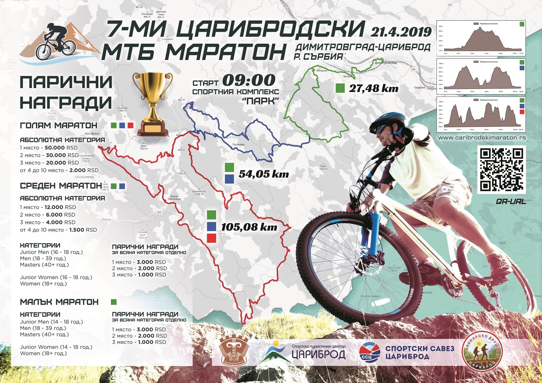 На 21. април тази година, в Димитровград-Цариброд, Р Сърбия, ще се проведе седмия Царибродски МТБ маратон. Старта е в 9 часът местно време в спортния център Парк. Повече за маратона можете да разберете тук http://caribrodskimaraton.rs/. Вече са открити заявките на страницата http://caribrodskimaraton.rs/prijave/. Трасетата са с дължина от 105, 54 и 27 километра, а можете да ги видите тук (както и правилата и наградите) http://caribrodskimaraton.rs/kategorije/. Информации и снимки има и на фейсбук страницата https://www.facebook.com/udimitrovgradu/... Паричните награди са страхотни, имайте в предвид че 1 лев е около 60 динара...