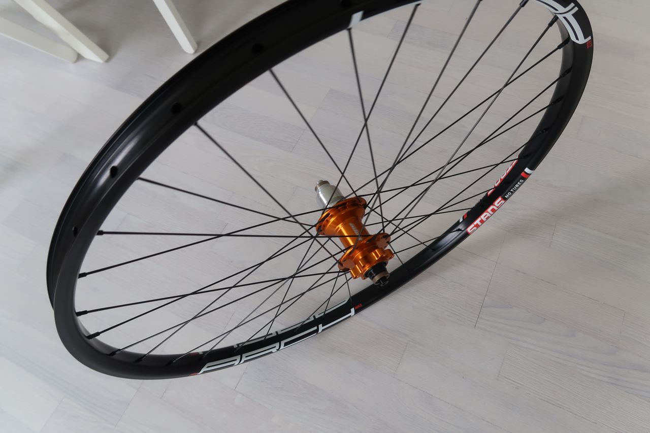 Следващото нещо са колелата. Тях на ги мислех кой знае колко (може би само шините) и се спрях на следната комбинация – моят стар фаворит Hope Pro 4 главини, шини Stan NoTubes Arch MK3, спици DT SuperComp и DT ProLock нипли. Както казах, шините ги мислех малко повече. Исках да са достатъчно леки, имайки предвид теглото на карача, но все пак не типични ХС капли. Не намерих нищо подходящо в каталога на DT и се спрях на NoTubes Arch, които с профила си и теглото си от приблизително 430гр., отговарят перфектно на целта.