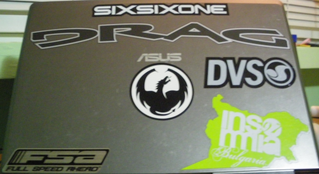 От тук като се обърна виждам MONGOOSE (x2), DARTMOOR, DRAG (x4), стикер "Обади се като стигнеш (h)", ТЕКТРО (х3), adidas (F50 - футболисти), Ripcurl и "една кола по-малко SHIMANO". :D