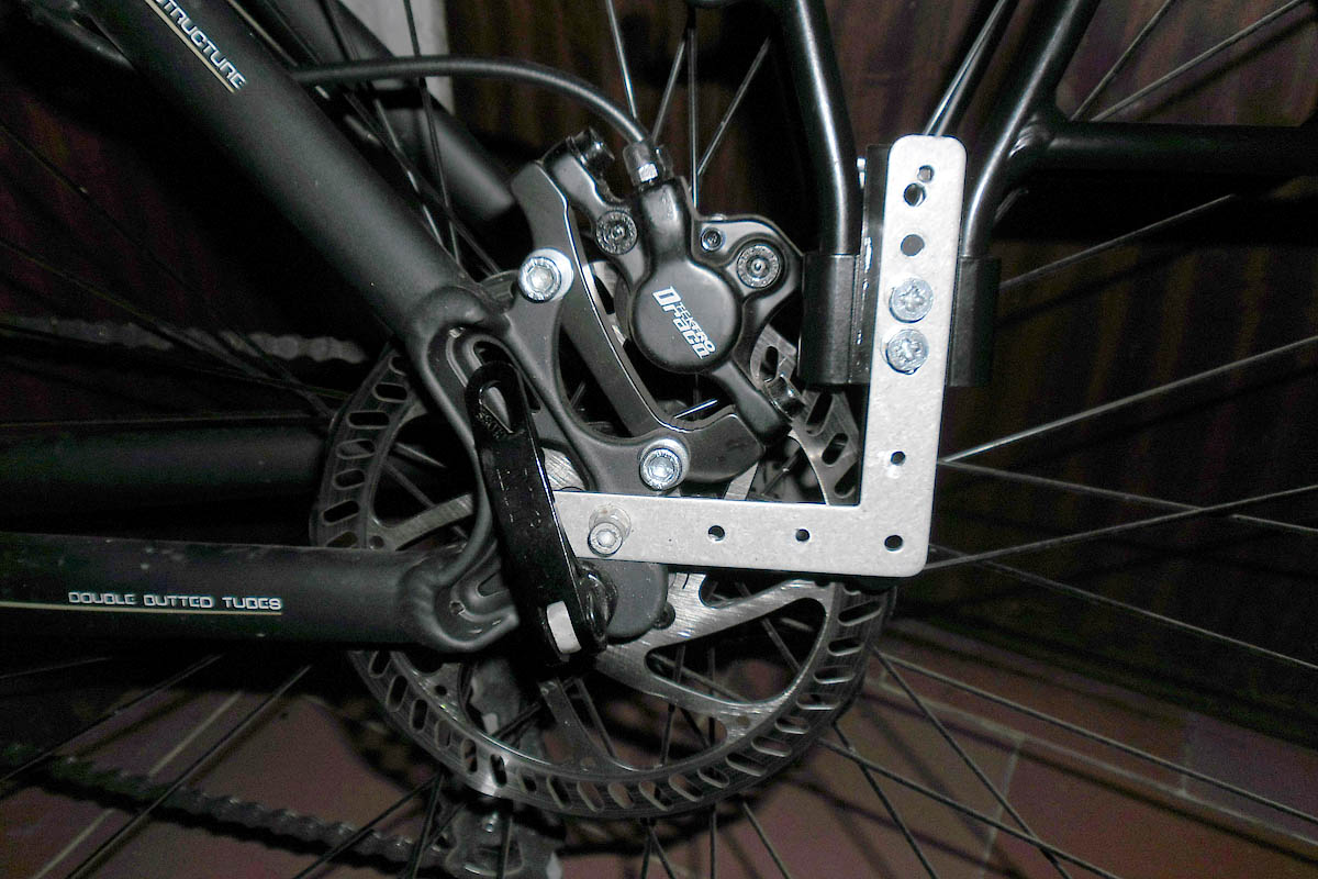 С Г-образните планки изнесох багажника с около 7см назад така не опира в спирачния апарат и слиза по-ниско. Просто ги захванах ги външно спрямо оригиналните скоби и всичко си дойде по местата. За мое голямо учудване всичко се намести и си застана право (мислех, че седи поне малко усукано) без да се налага допълнителна корекция.