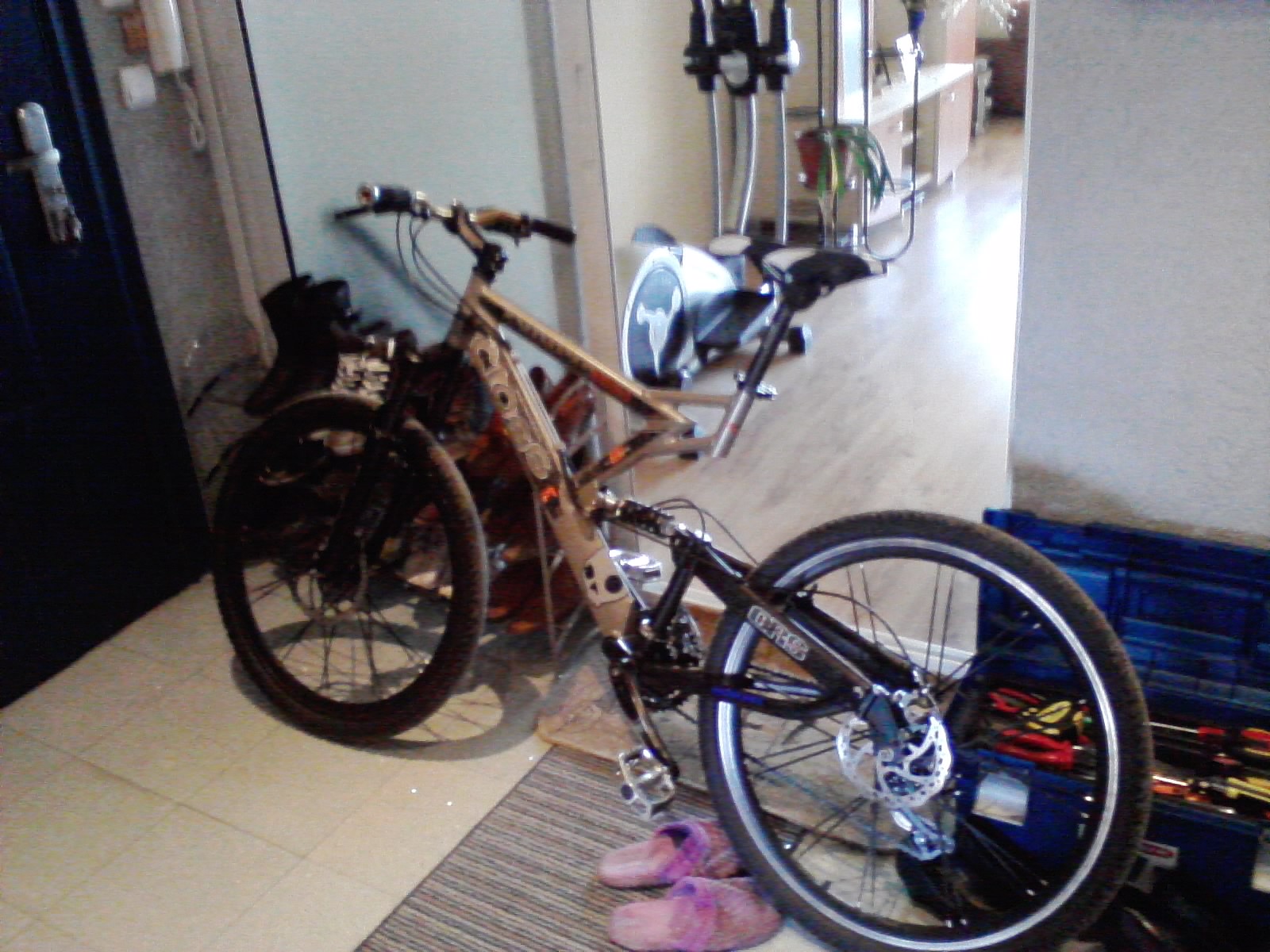 Ето и снимки на почти готовия вариант, като се има в предвид, че гумите и шока още не са сменени и не съм монтирал предния апарат - shimano. Имах малък проблем с вилката, затова изглежда като 80мм :D , но го оправих. Като цяло